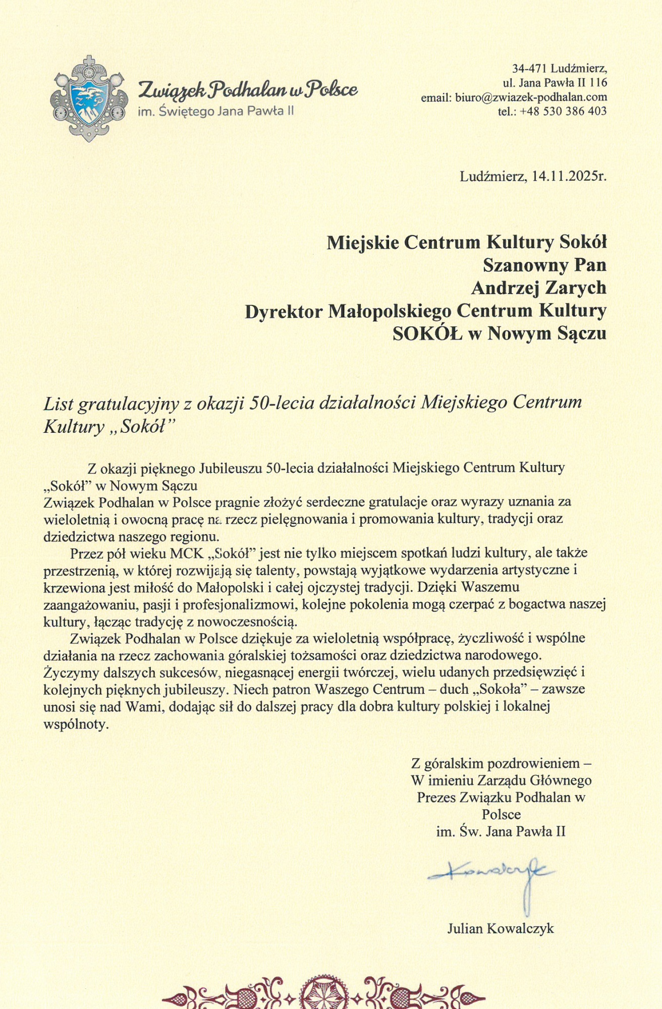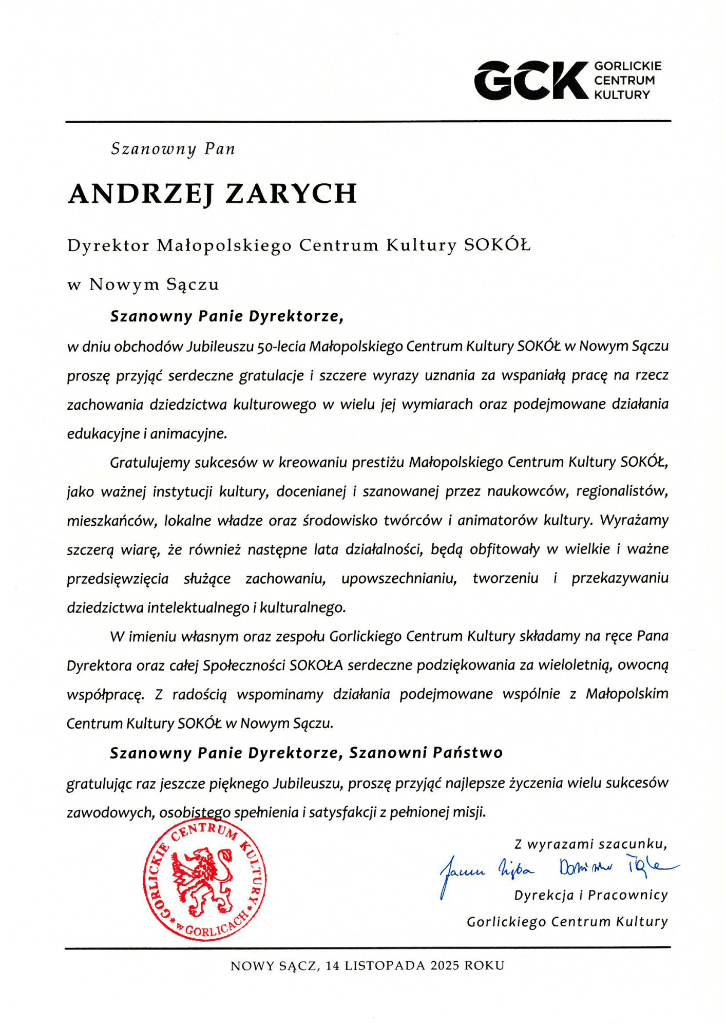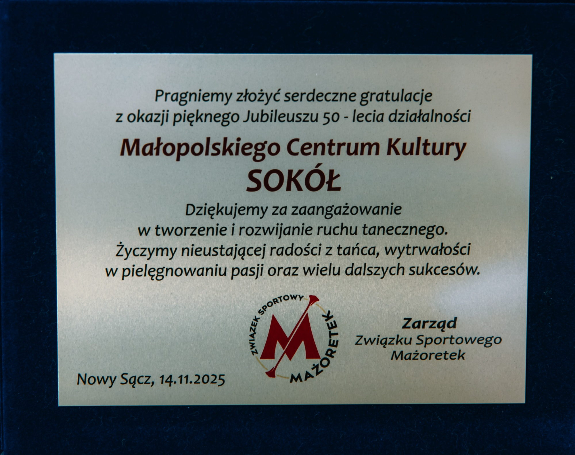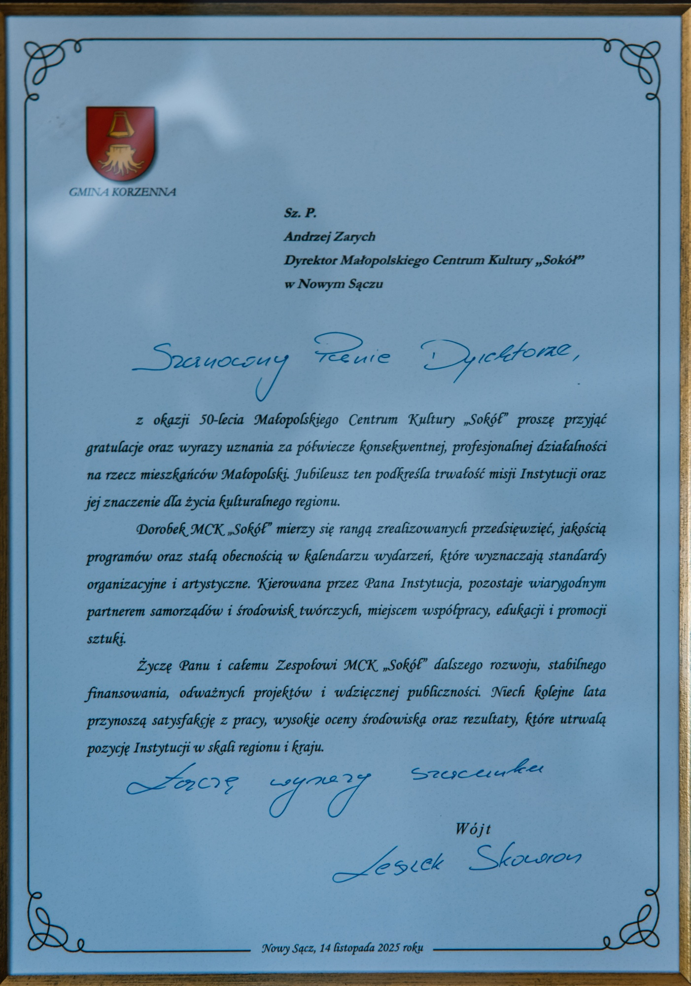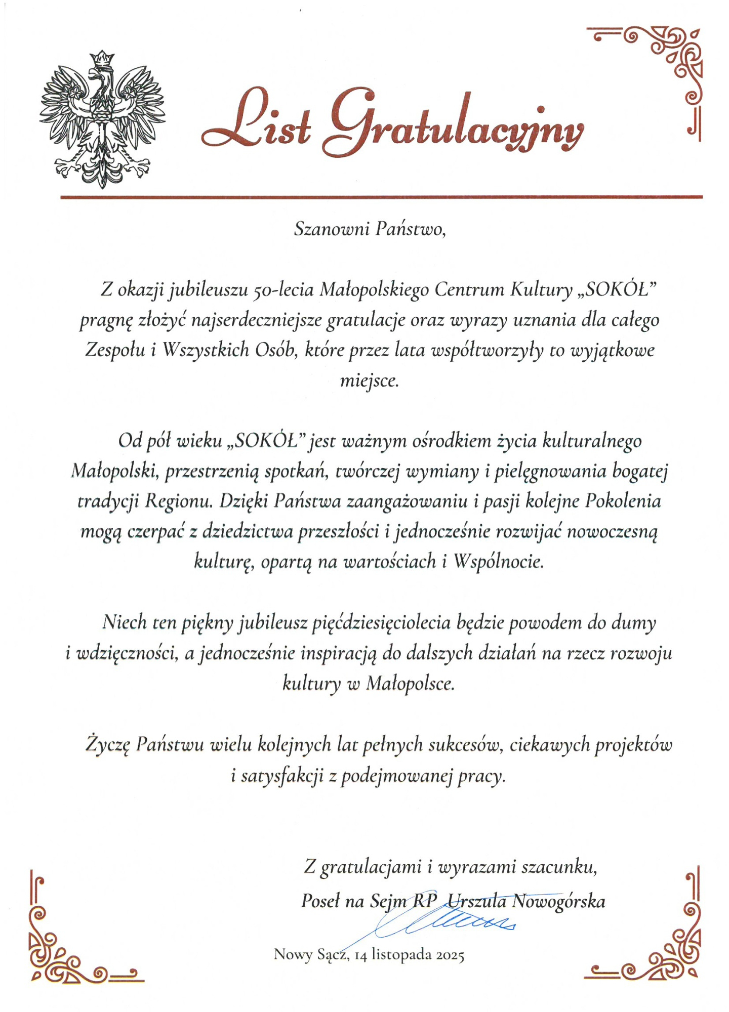 14 listopada 2025 roku odbyły się uroczyste obchody 50-lecia działalności Małopolskiego Centrum Kultury SOKÓŁ w Nowym Sączu. W nawiązaniu do tego wyjątkowego wydarzenia, pragniemy złożyć serdeczne podziękowania wszystkim władzom państwowym i samorządowym, instytucjom partnerskim oraz Przyjaciołom SOKOŁA, którzy zechcieli uświetnić nasz Złoty Jubileusz swoją obecnością, a także przesłanymi życzeniami, upominkami i listami gratulacyjnymi. Był to dla nas niezwykle wzruszający moment.