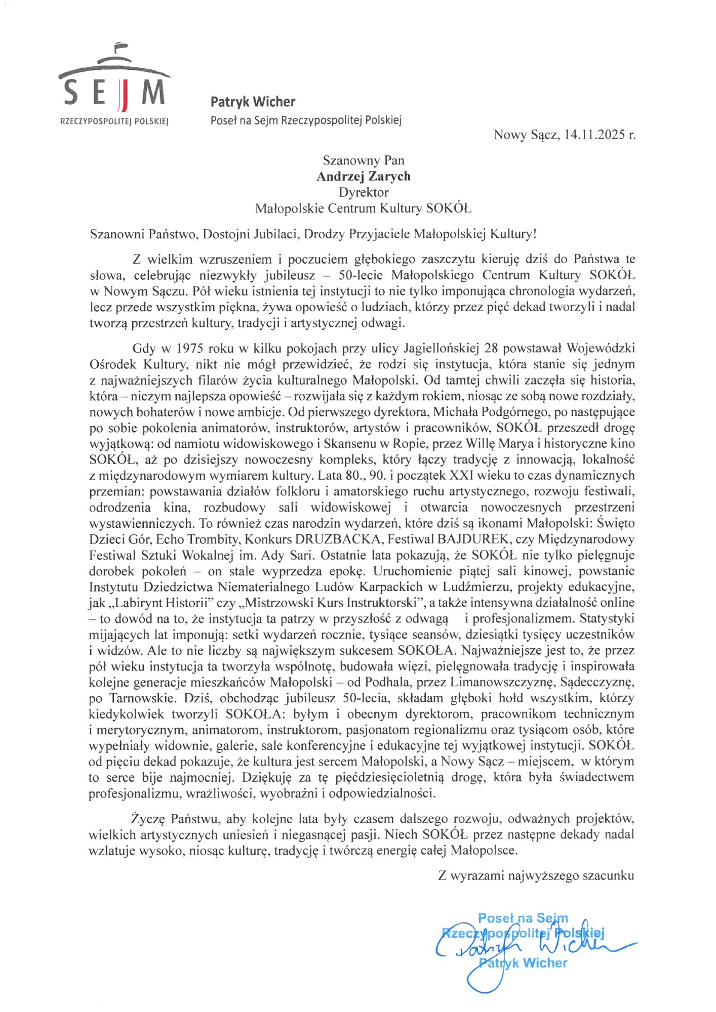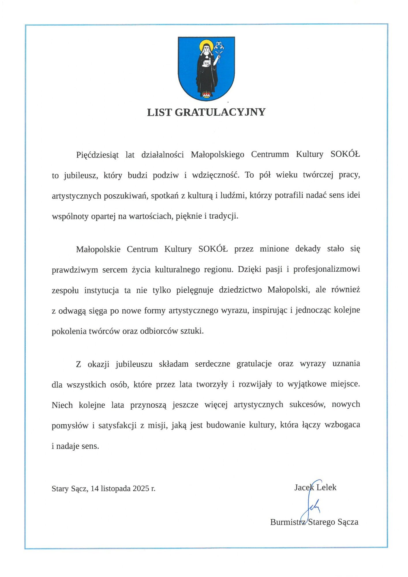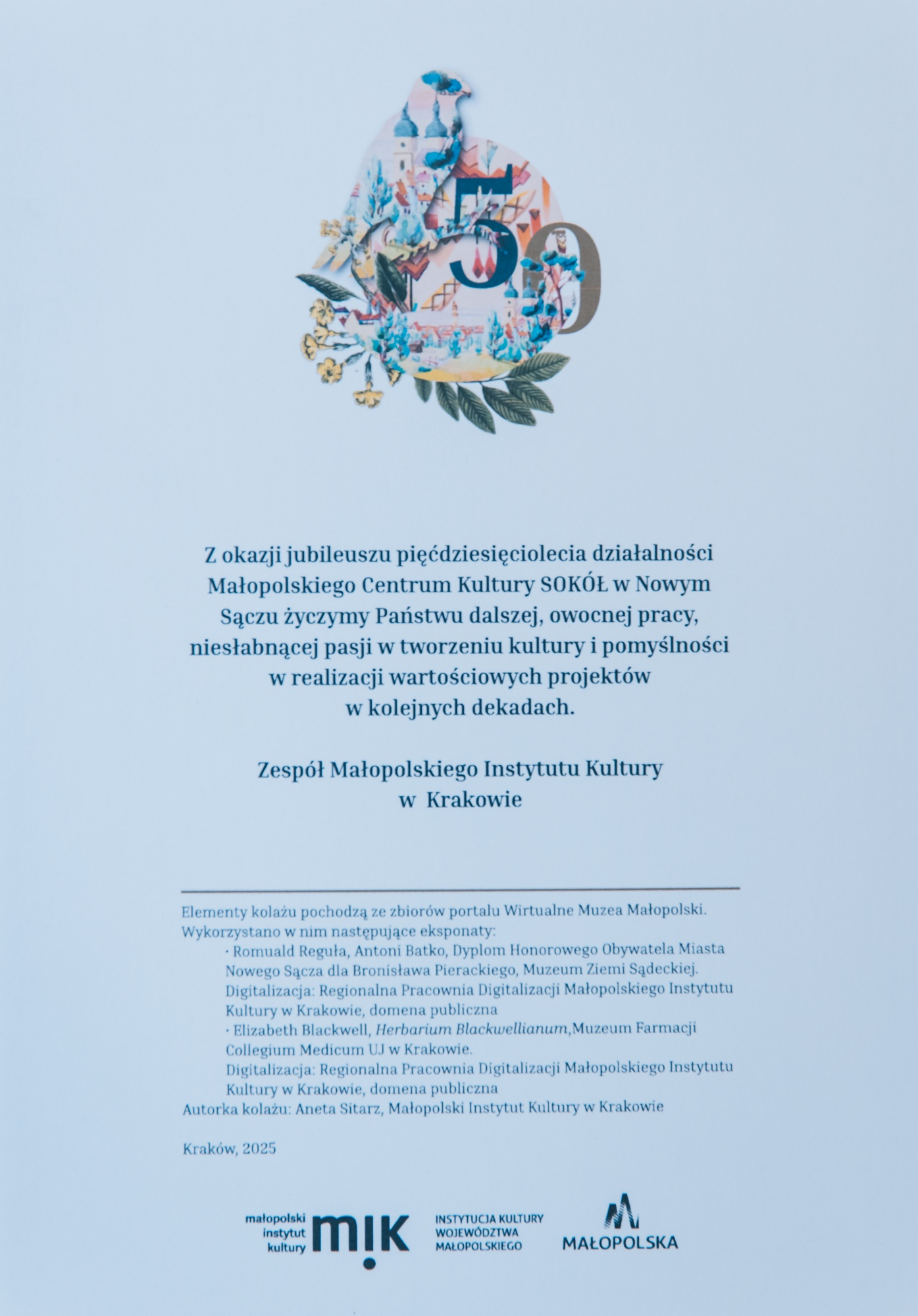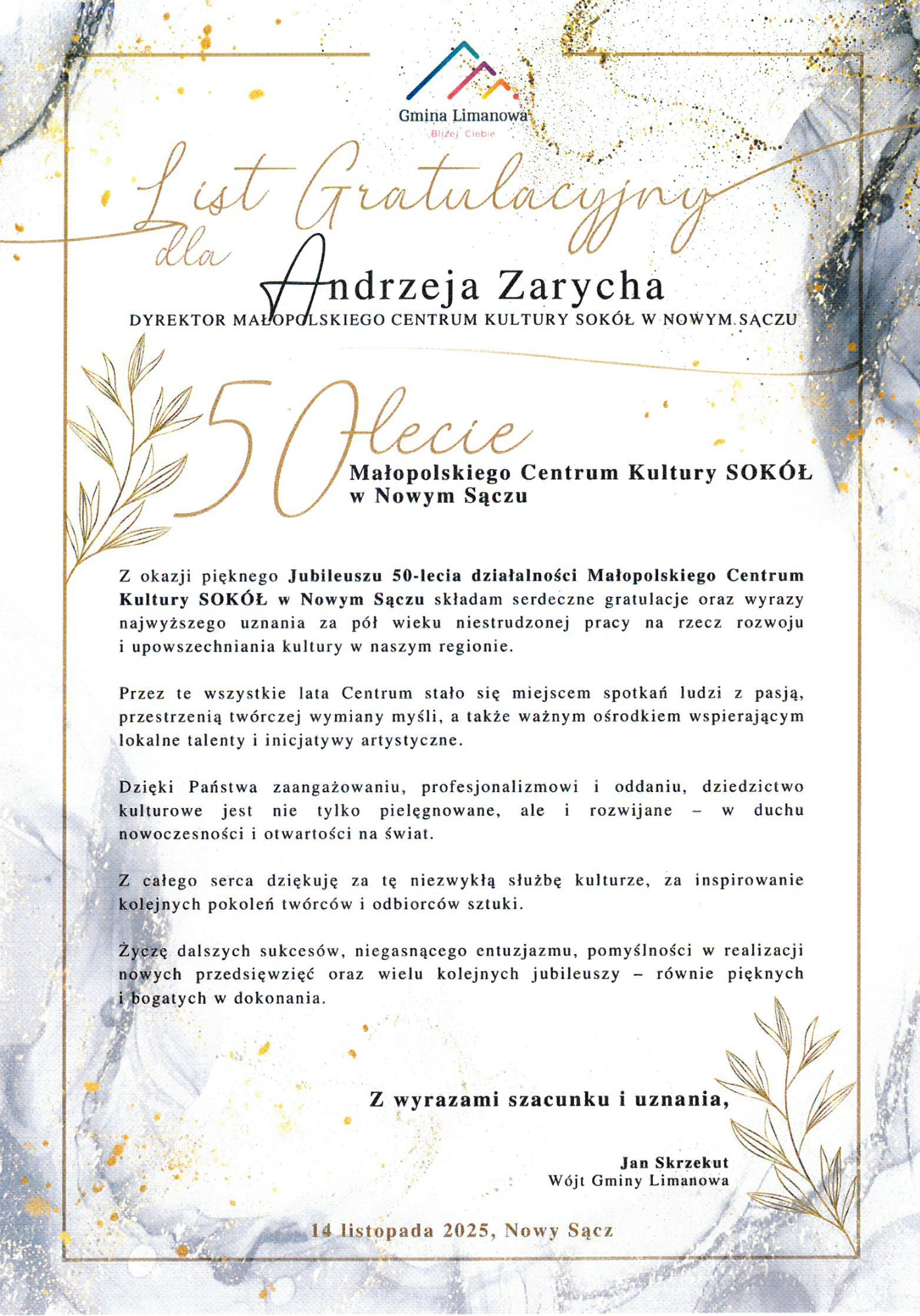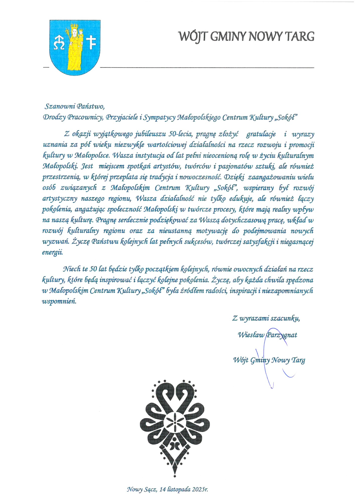 14 listopada 2025 roku odbyły się uroczyste obchody 50-lecia działalności Małopolskiego Centrum Kultury SOKÓŁ w Nowym Sączu. W nawiązaniu do tego wyjątkowego wydarzenia, pragniemy złożyć serdeczne podziękowania wszystkim władzom państwowym i samorządowym, instytucjom partnerskim oraz Przyjaciołom SOKOŁA, którzy zechcieli uświetnić nasz Złoty Jubileusz swoją obecnością, a także przesłanymi życzeniami, upominkami i listami gratulacyjnymi. Był to dla nas niezwykle wzruszający moment.