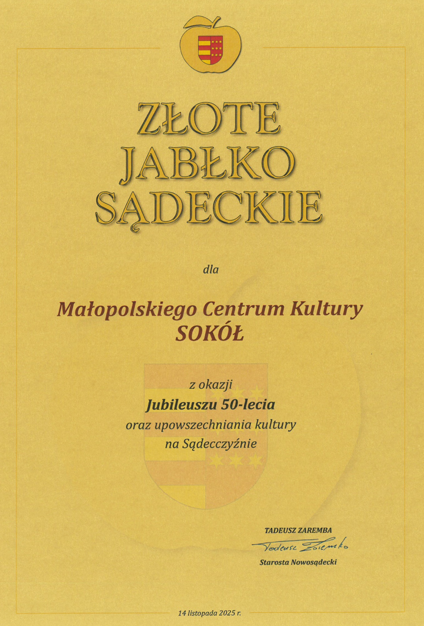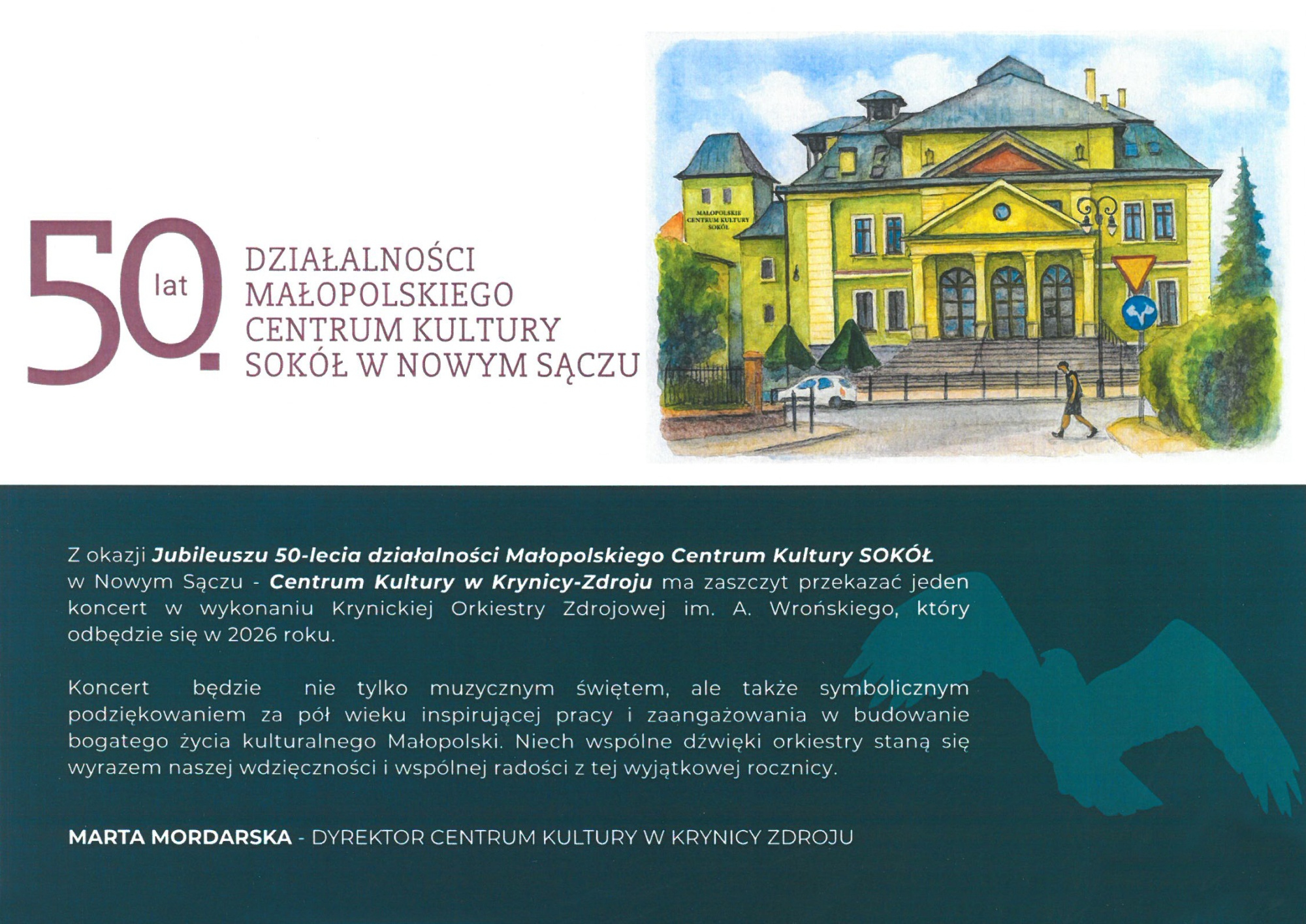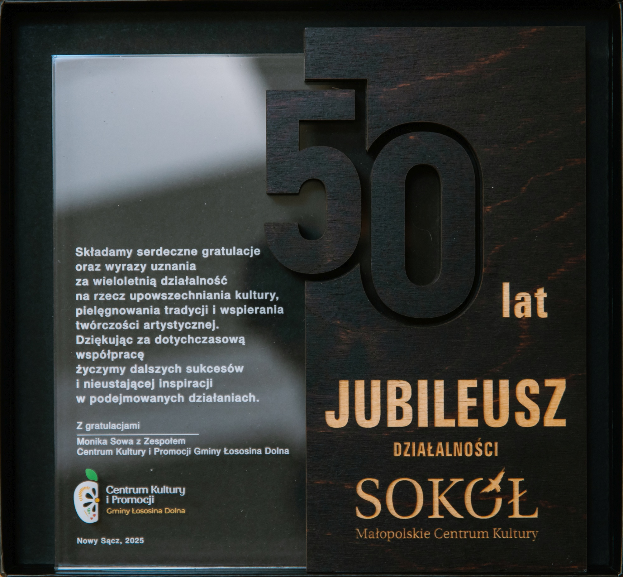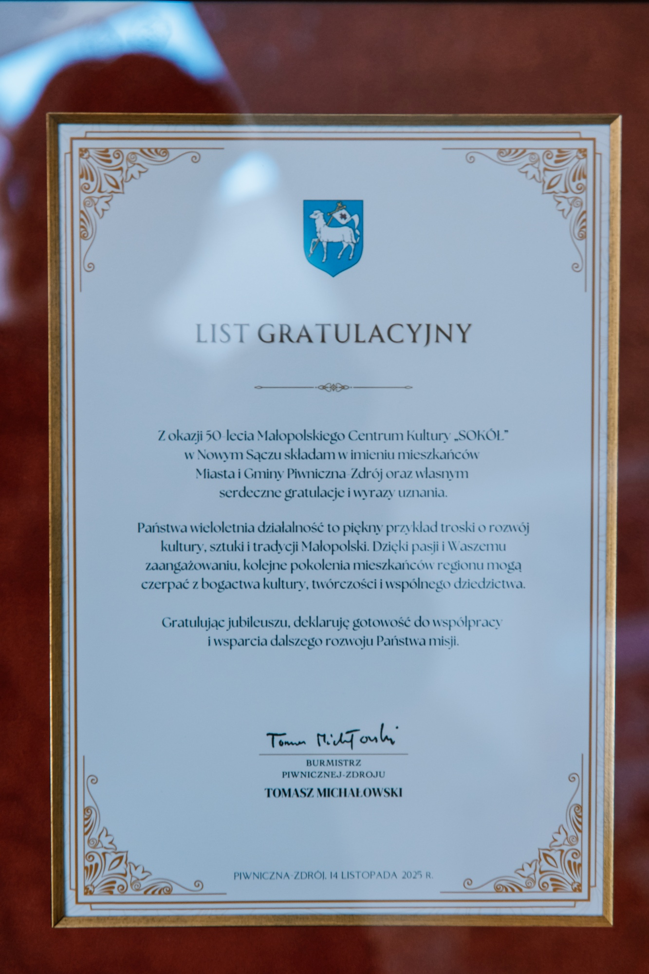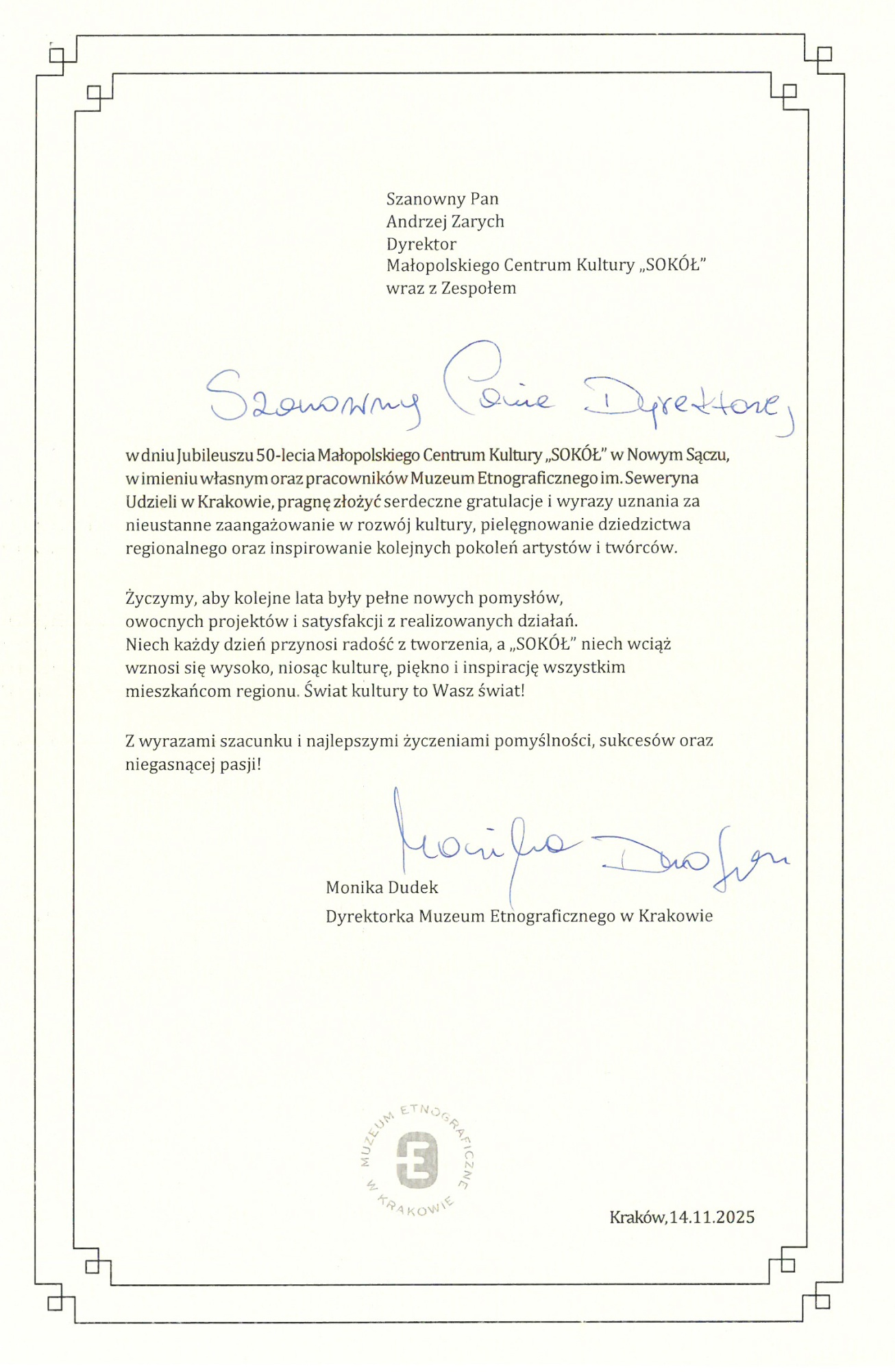 14 listopada 2025 roku odbyły się uroczyste obchody 50-lecia działalności Małopolskiego Centrum Kultury SOKÓŁ w Nowym Sączu. W nawiązaniu do tego wyjątkowego wydarzenia, pragniemy złożyć serdeczne podziękowania wszystkim władzom państwowym i samorządowym, instytucjom partnerskim oraz Przyjaciołom SOKOŁA, którzy zechcieli uświetnić nasz Złoty Jubileusz swoją obecnością, a także przesłanymi życzeniami, upominkami i listami gratulacyjnymi. Był to dla nas niezwykle wzruszający moment.