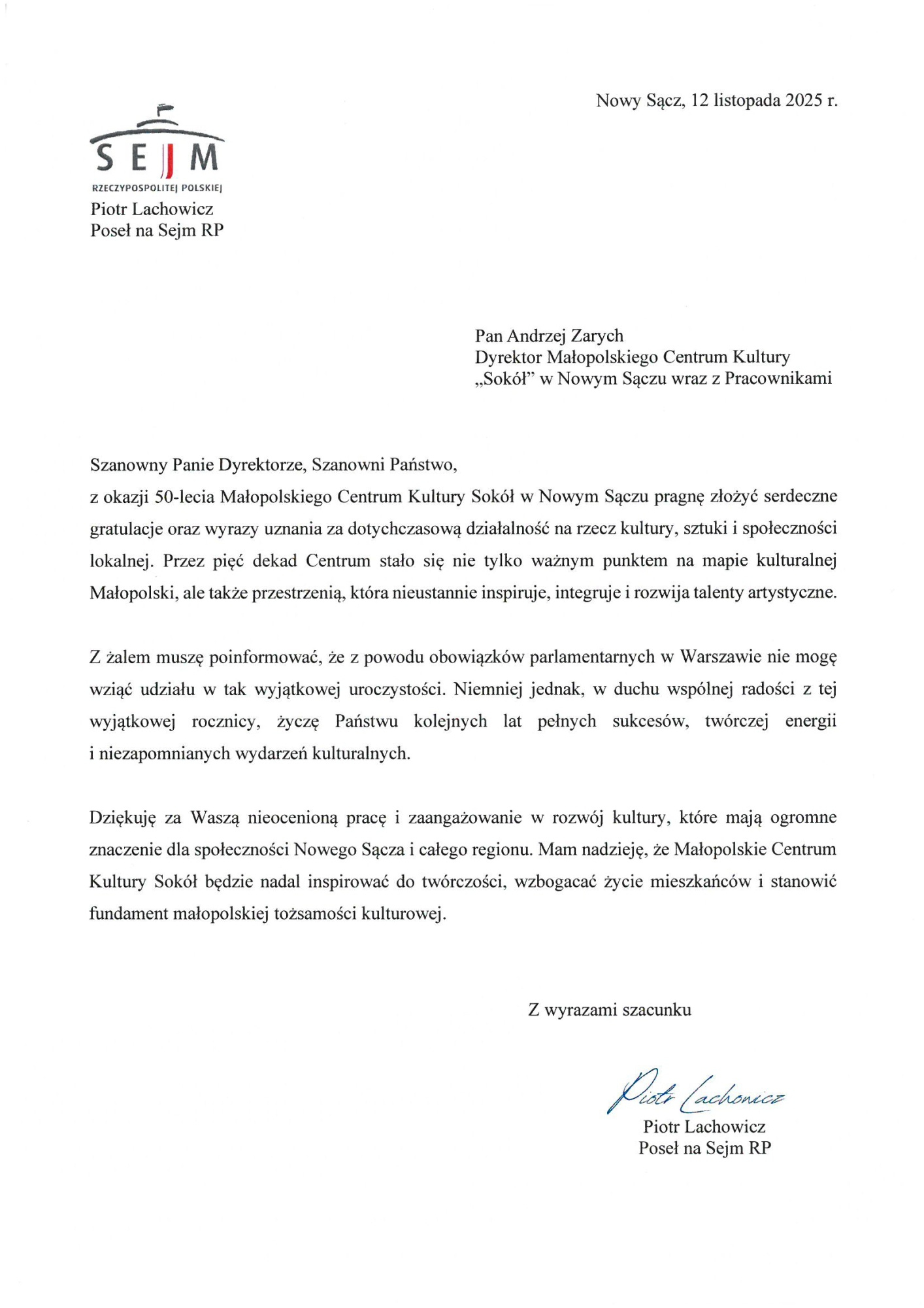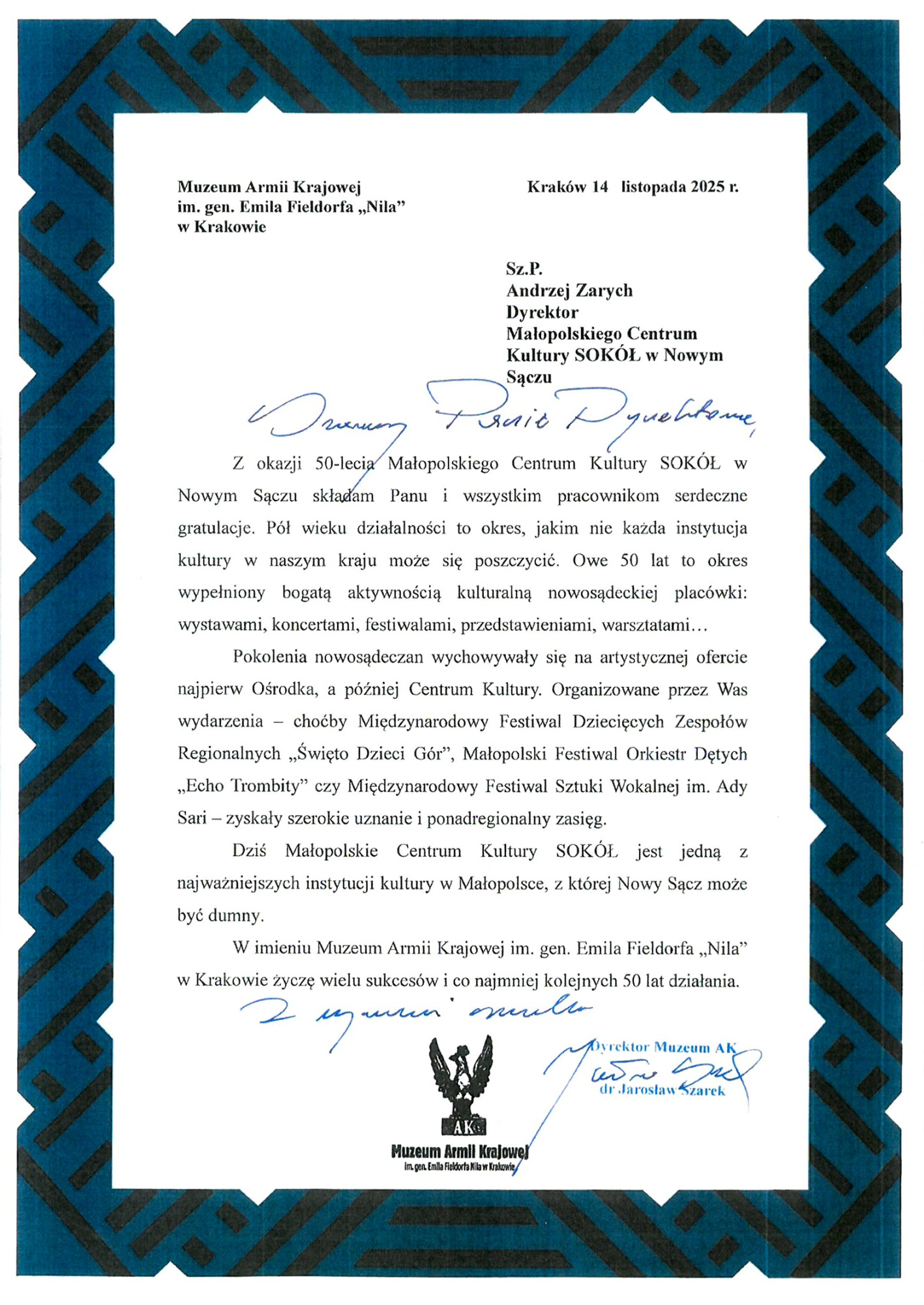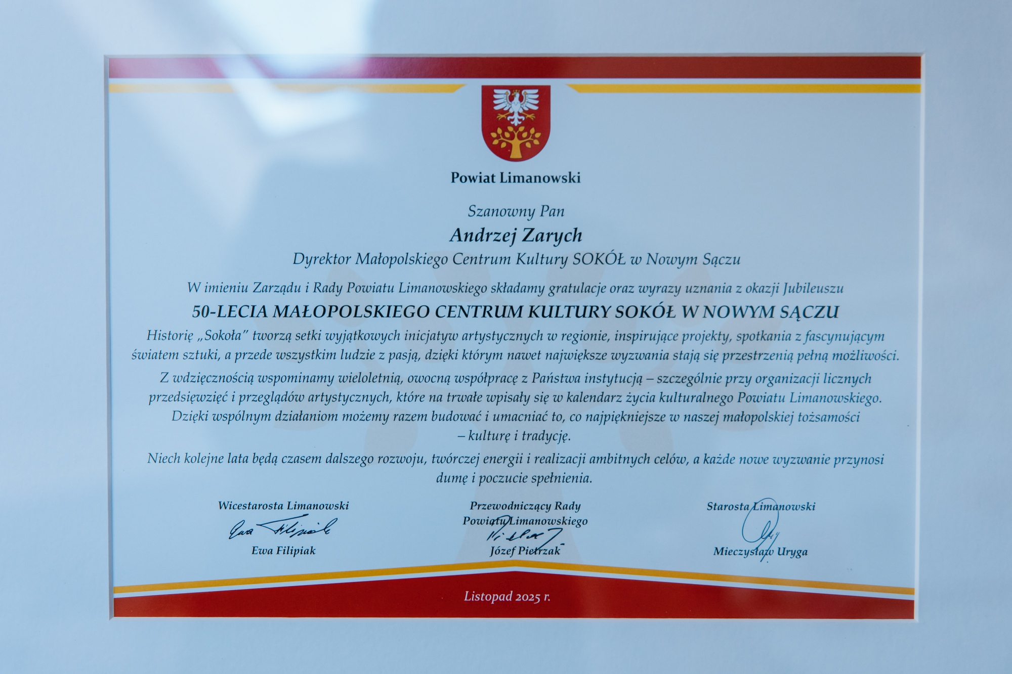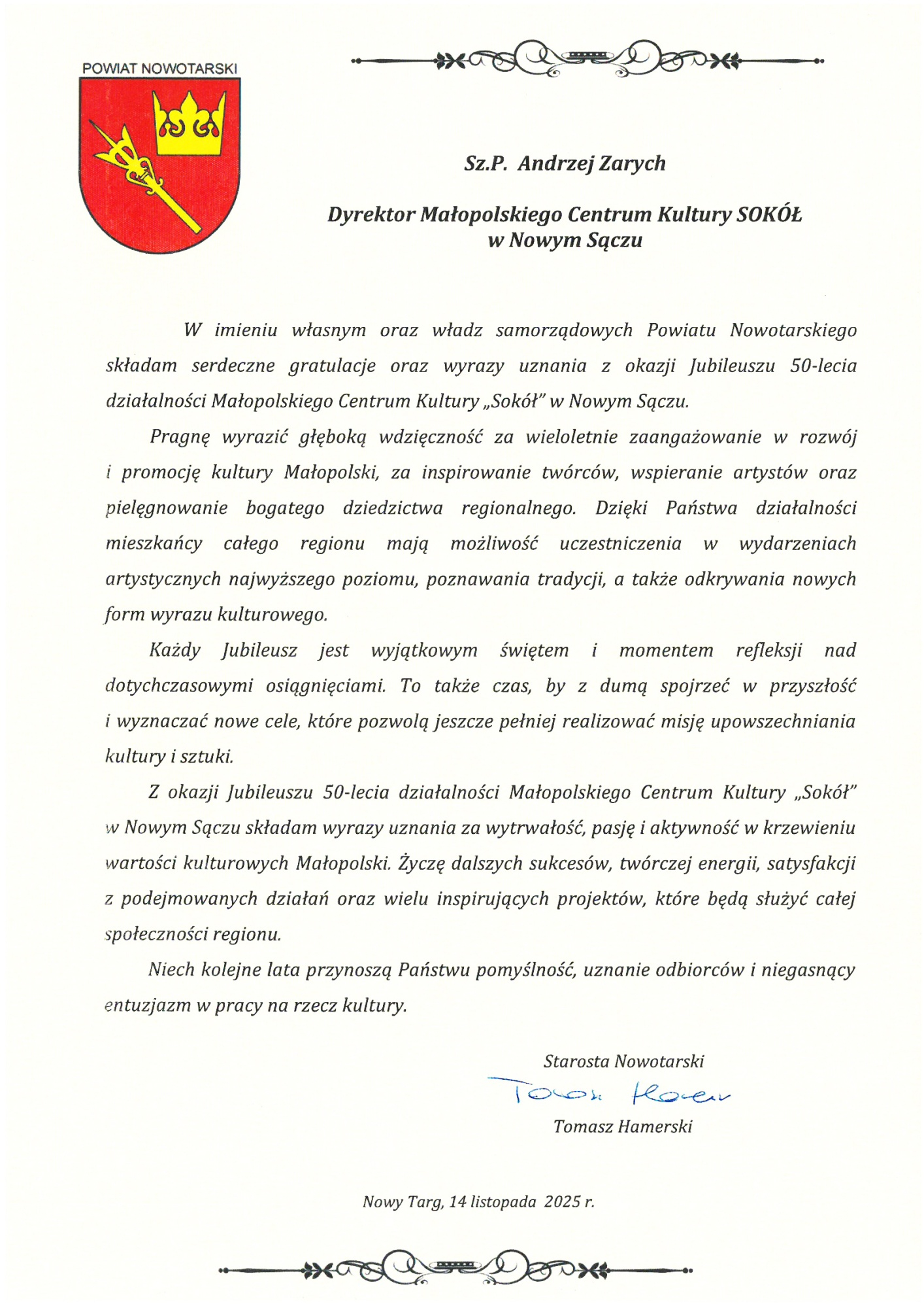 14 listopada 2025 roku odbyły się uroczyste obchody 50-lecia działalności Małopolskiego Centrum Kultury SOKÓŁ w Nowym Sączu. W nawiązaniu do tego wyjątkowego wydarzenia, pragniemy złożyć serdeczne podziękowania wszystkim władzom państwowym i samorządowym, instytucjom partnerskim oraz Przyjaciołom SOKOŁA, którzy zechcieli uświetnić nasz Złoty Jubileusz swoją obecnością, a także przesłanymi życzeniami, upominkami i listami gratulacyjnymi. Był to dla nas niezwykle wzruszający moment.