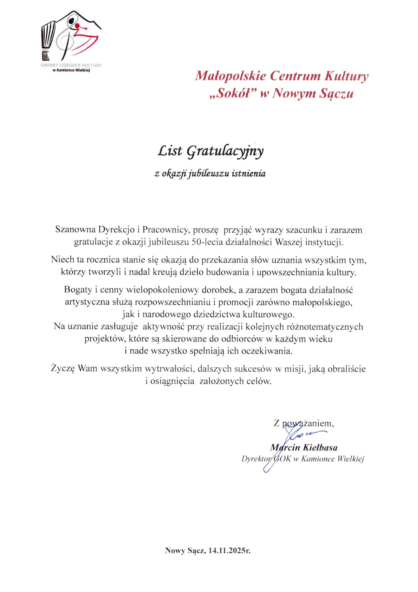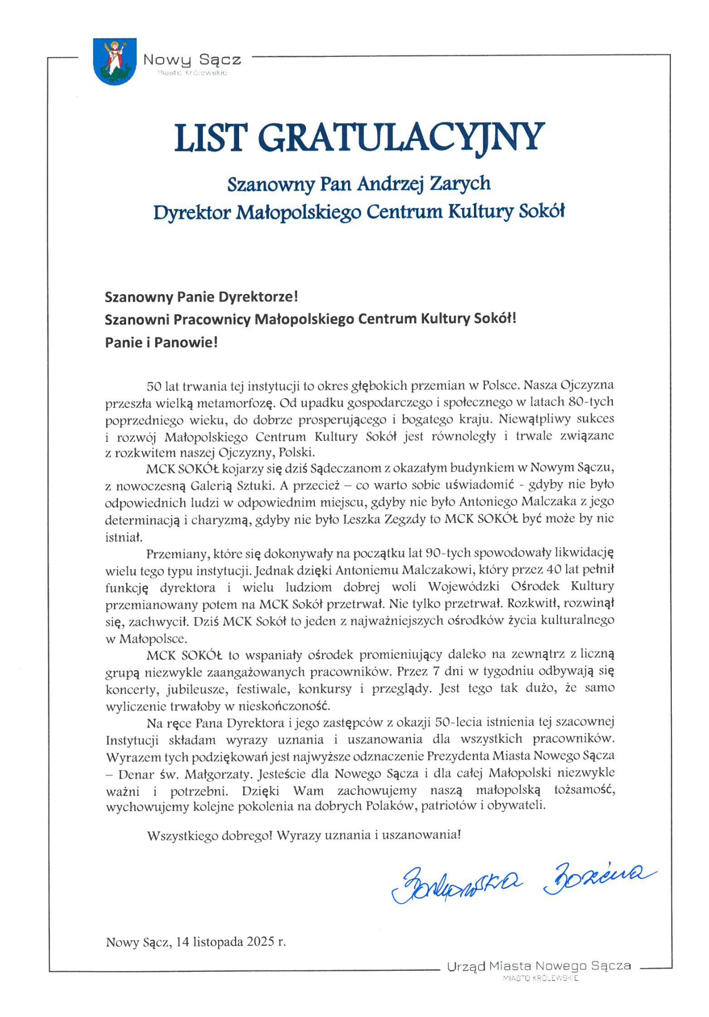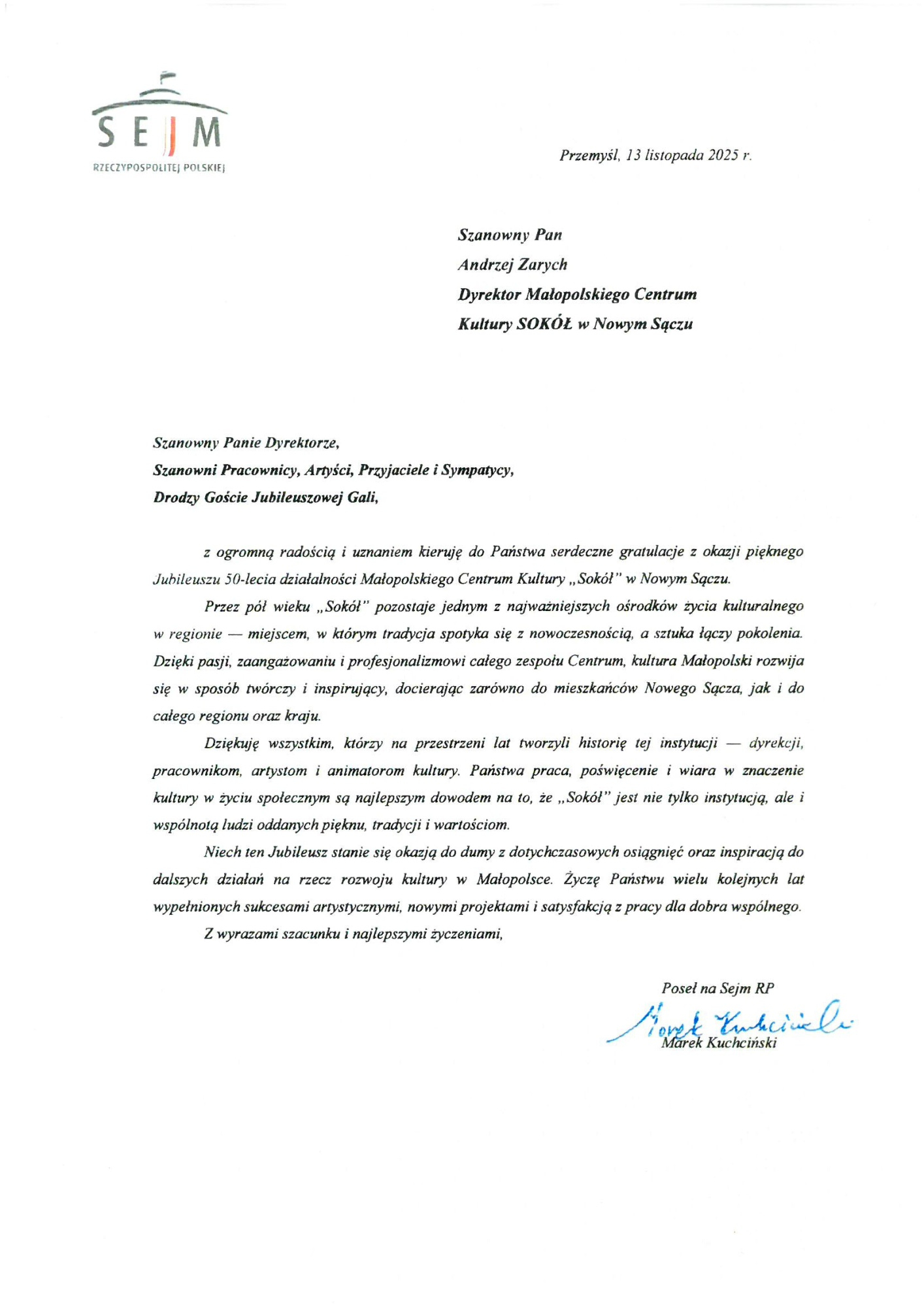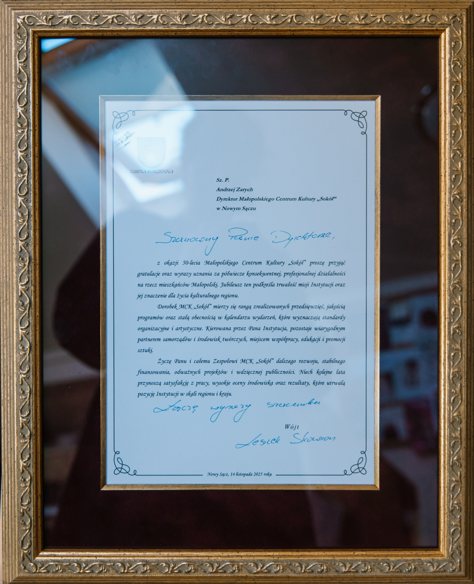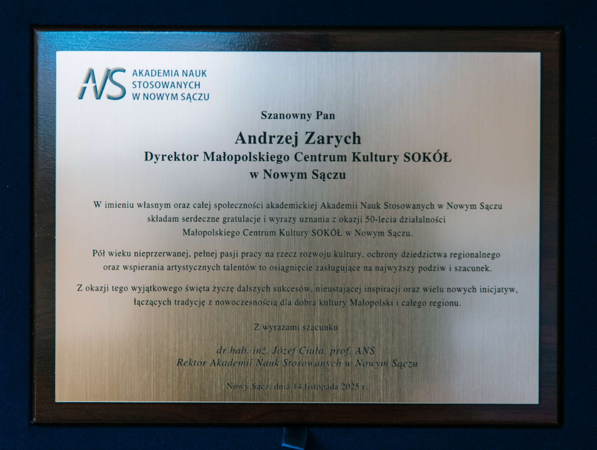 14 listopada 2025 roku odbyły się uroczyste obchody 50-lecia działalności Małopolskiego Centrum Kultury SOKÓŁ w Nowym Sączu. W nawiązaniu do tego wyjątkowego wydarzenia, pragniemy złożyć serdeczne podziękowania wszystkim władzom państwowym i samorządowym, instytucjom partnerskim oraz Przyjaciołom SOKOŁA, którzy zechcieli uświetnić nasz Złoty Jubileusz swoją obecnością, a także przesłanymi życzeniami, upominkami i listami gratulacyjnymi. Był to dla nas niezwykle wzruszający moment.