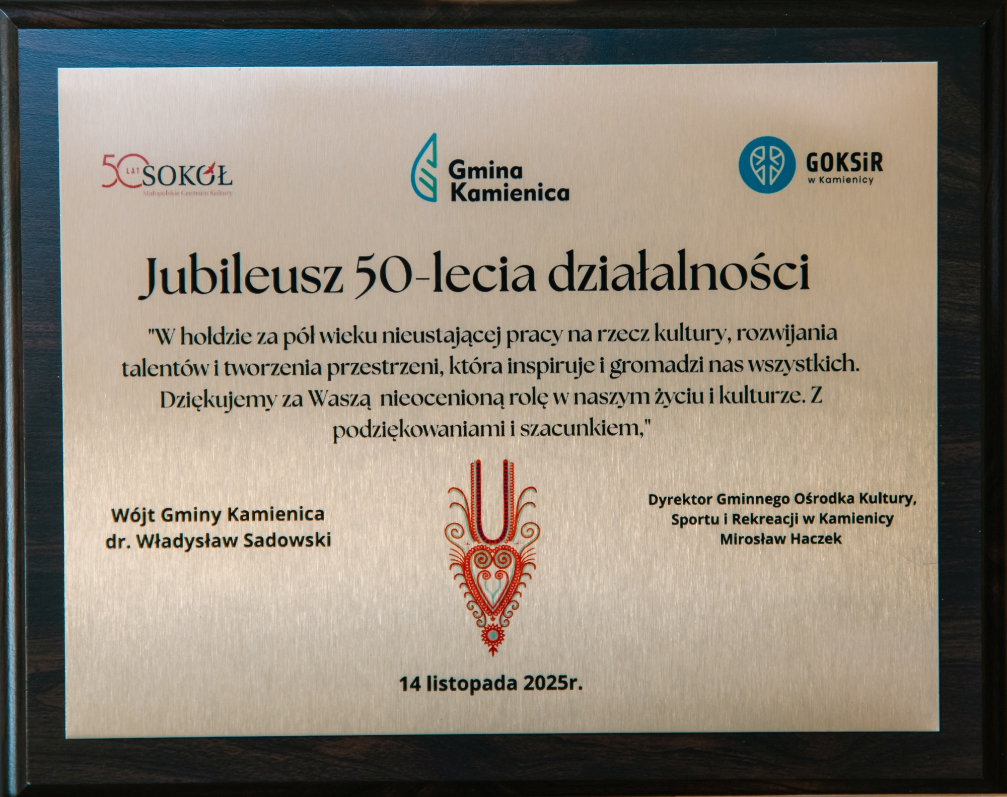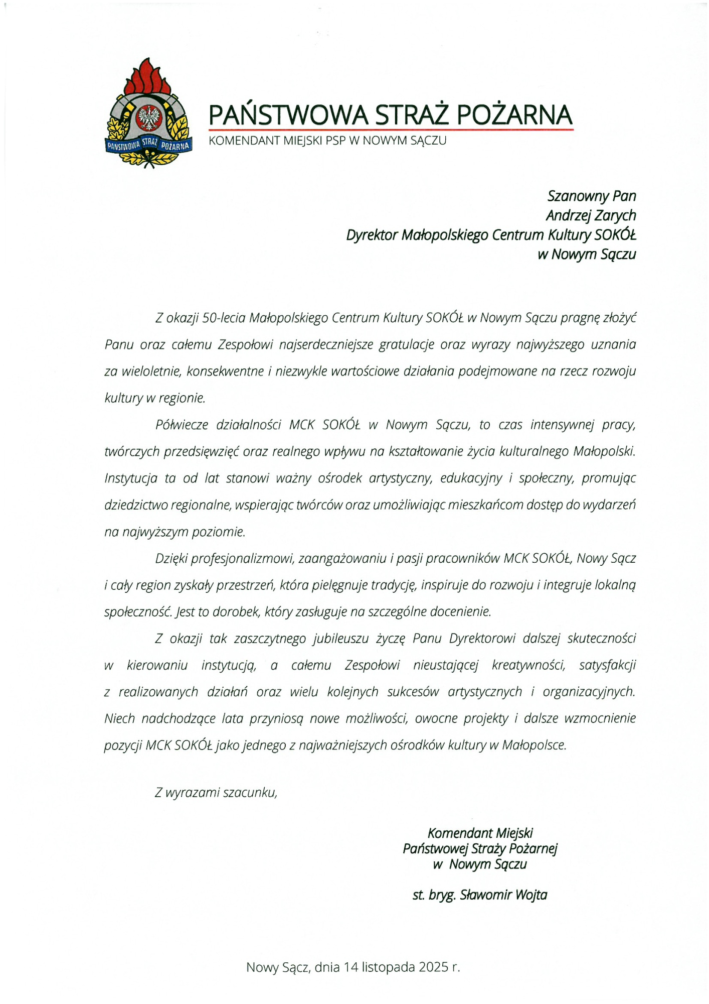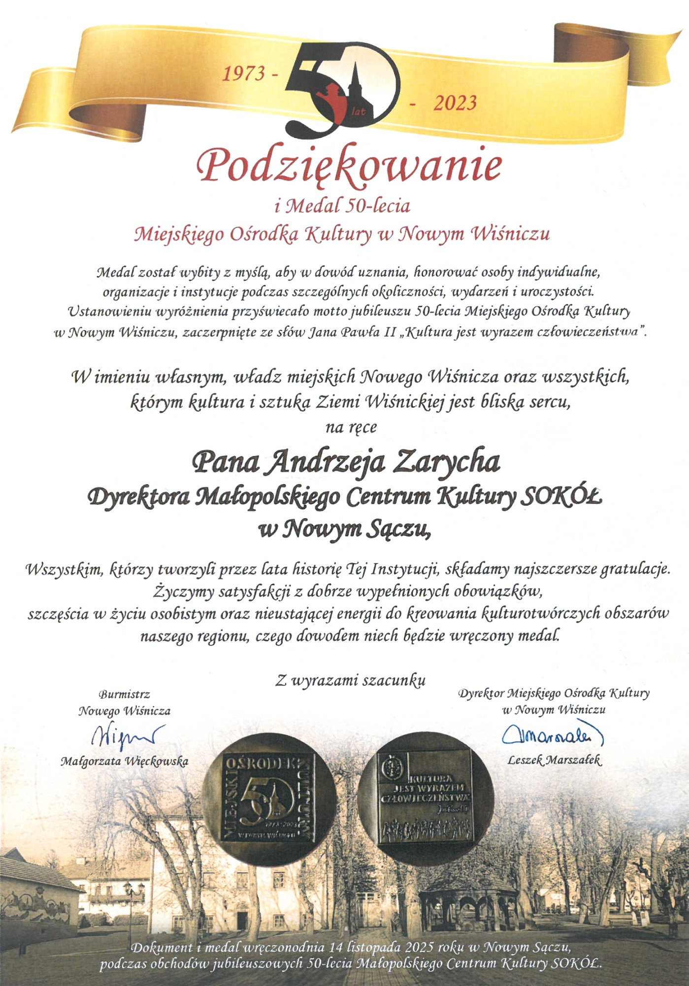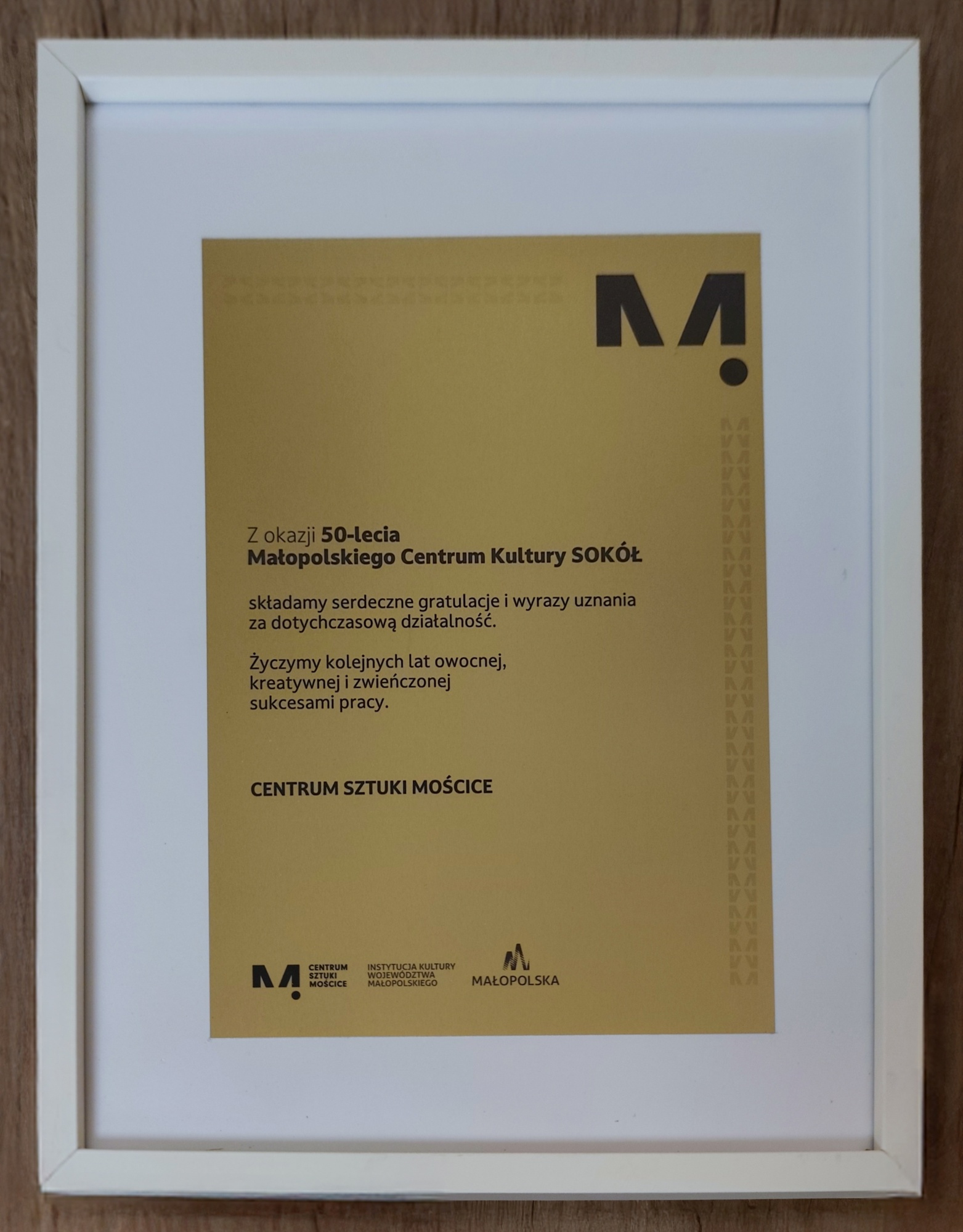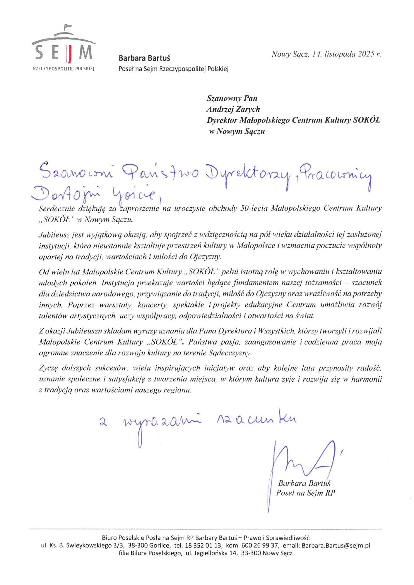 14 listopada 2025 roku odbyły się uroczyste obchody 50-lecia działalności Małopolskiego Centrum Kultury SOKÓŁ w Nowym Sączu. W nawiązaniu do tego wyjątkowego wydarzenia, pragniemy złożyć serdeczne podziękowania wszystkim władzom państwowym i samorządowym, instytucjom partnerskim oraz Przyjaciołom SOKOŁA, którzy zechcieli uświetnić nasz Złoty Jubileusz swoją obecnością, a także przesłanymi życzeniami, upominkami i listami gratulacyjnymi. Był to dla nas niezwykle wzruszający moment.