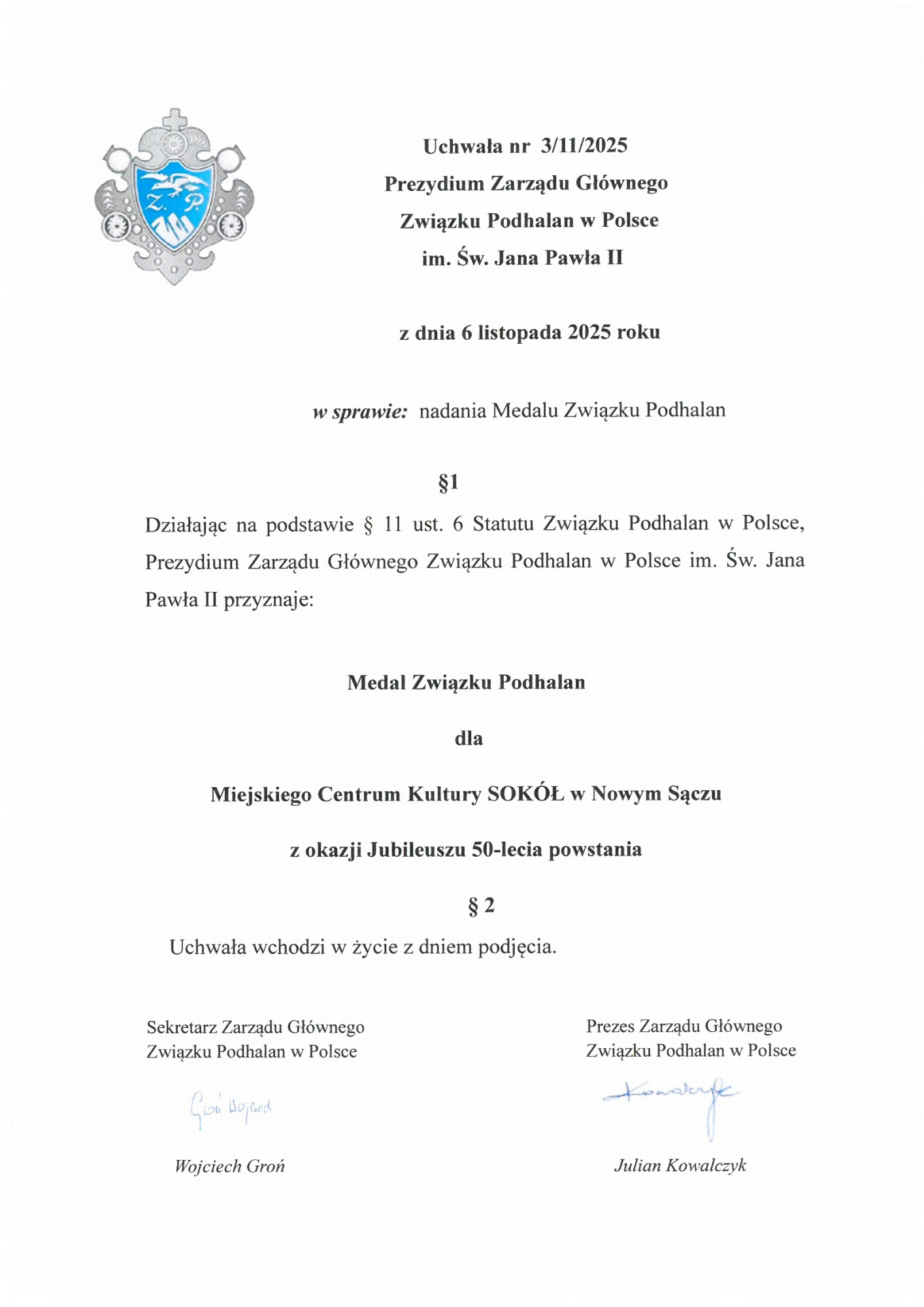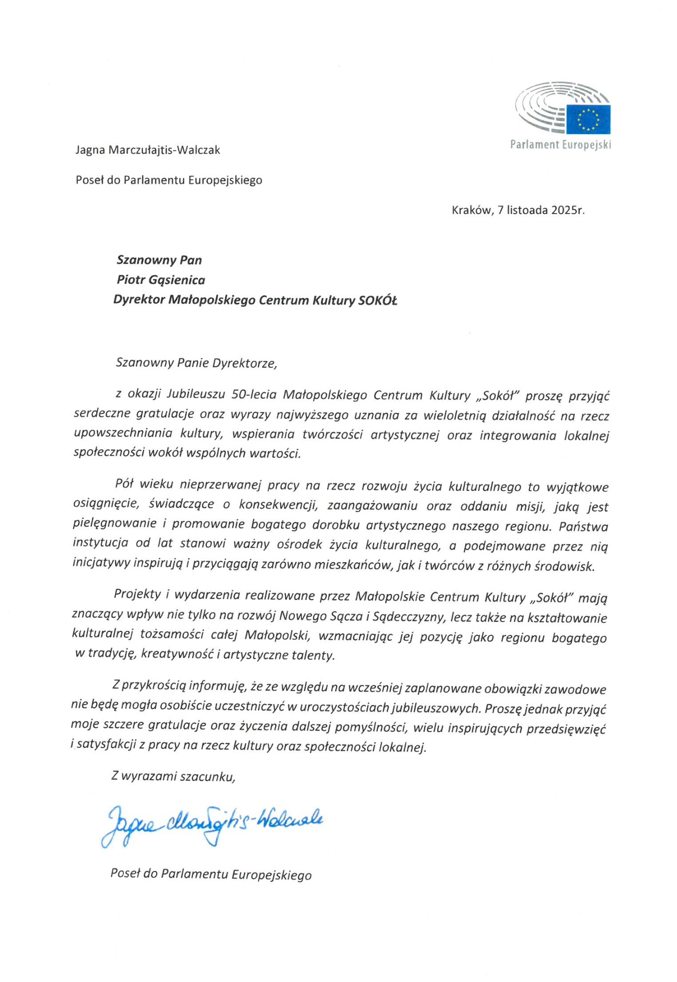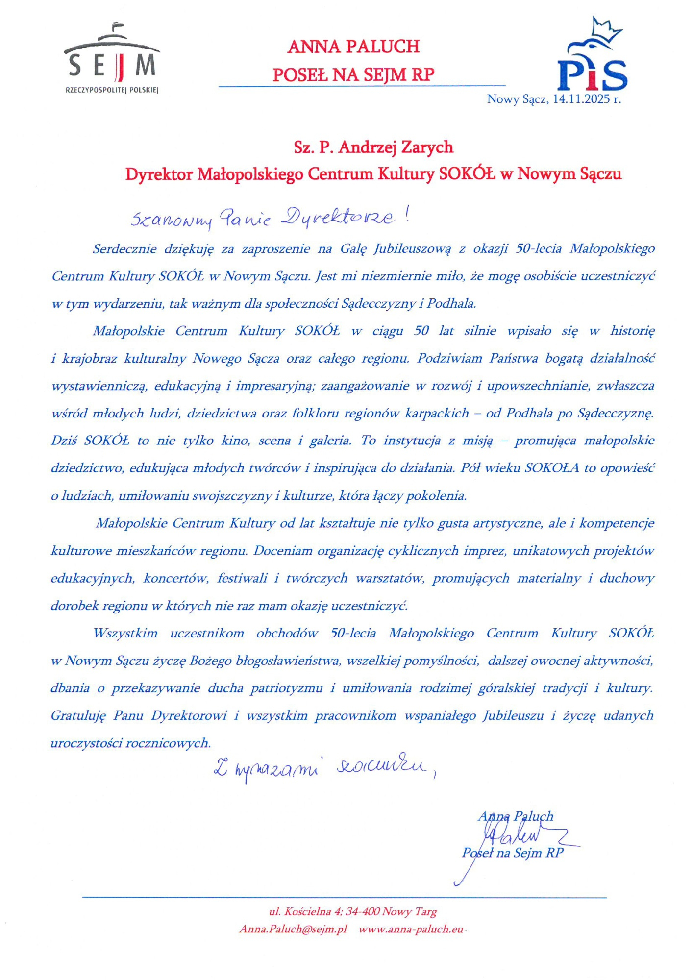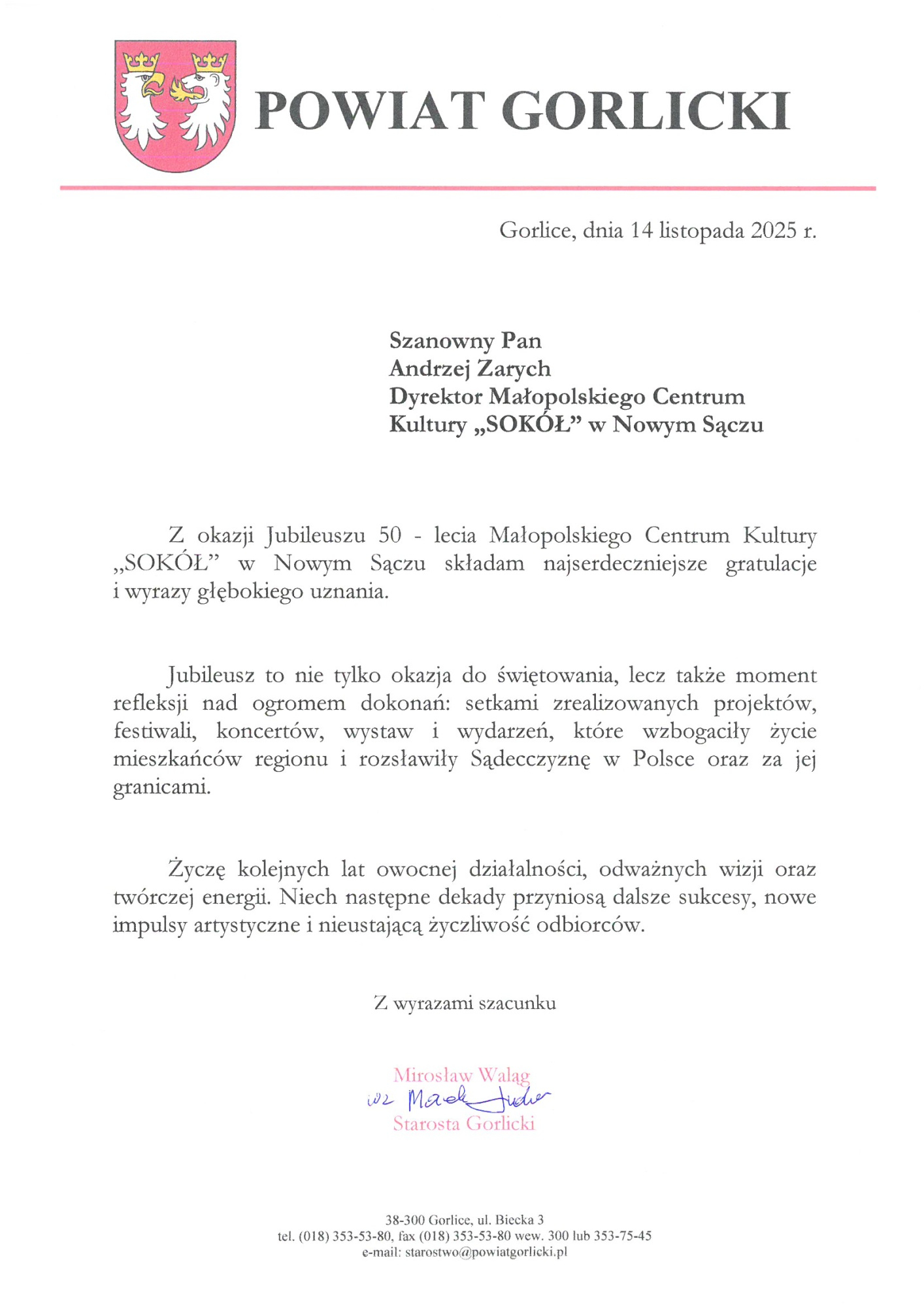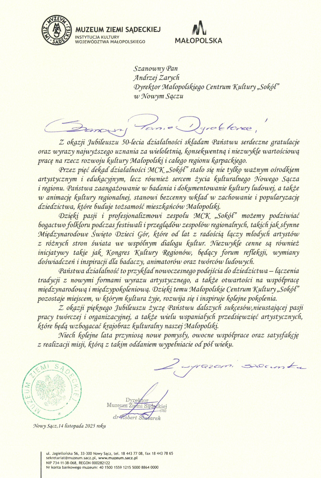 14 listopada 2025 roku odbyły się uroczyste obchody 50-lecia działalności Małopolskiego Centrum Kultury SOKÓŁ w Nowym Sączu. W nawiązaniu do tego wyjątkowego wydarzenia, pragniemy złożyć serdeczne podziękowania wszystkim władzom państwowym i samorządowym, instytucjom partnerskim oraz Przyjaciołom SOKOŁA, którzy zechcieli uświetnić nasz Złoty Jubileusz swoją obecnością, a także przesłanymi życzeniami, upominkami i listami gratulacyjnymi. Był to dla nas niezwykle wzruszający moment.