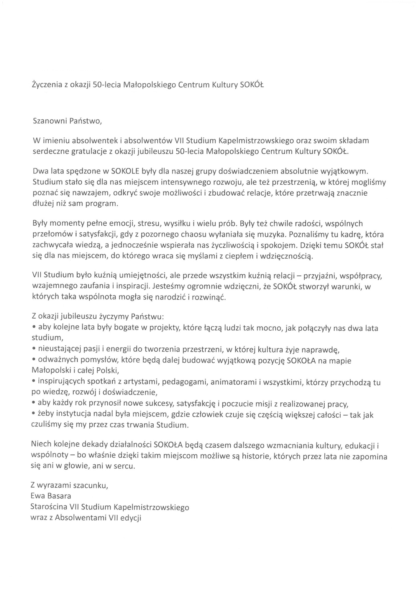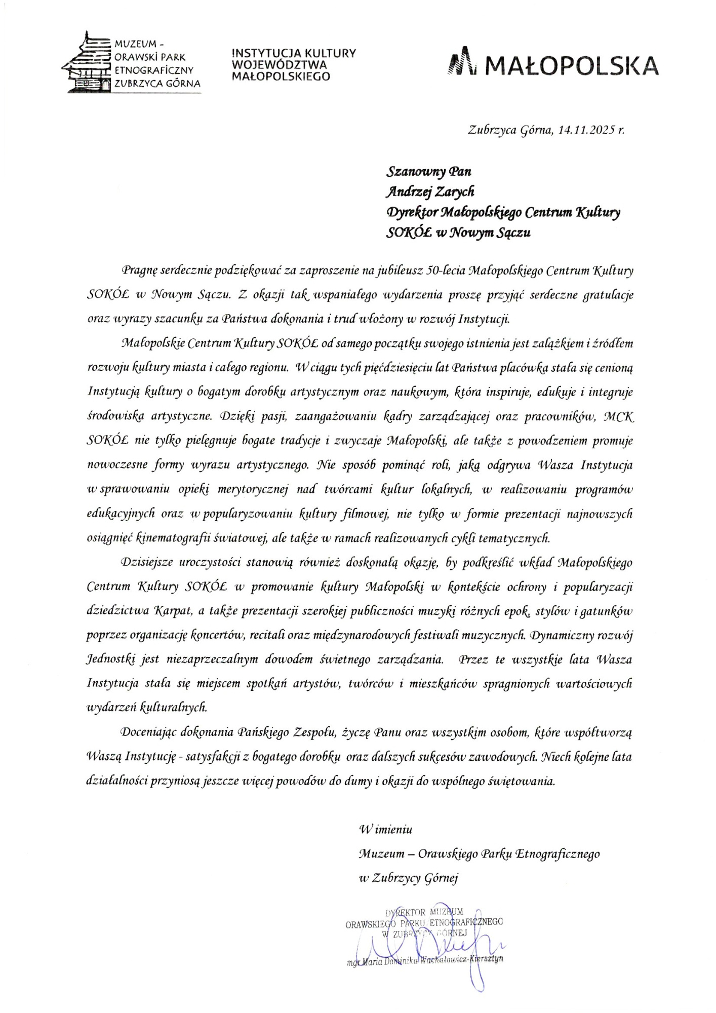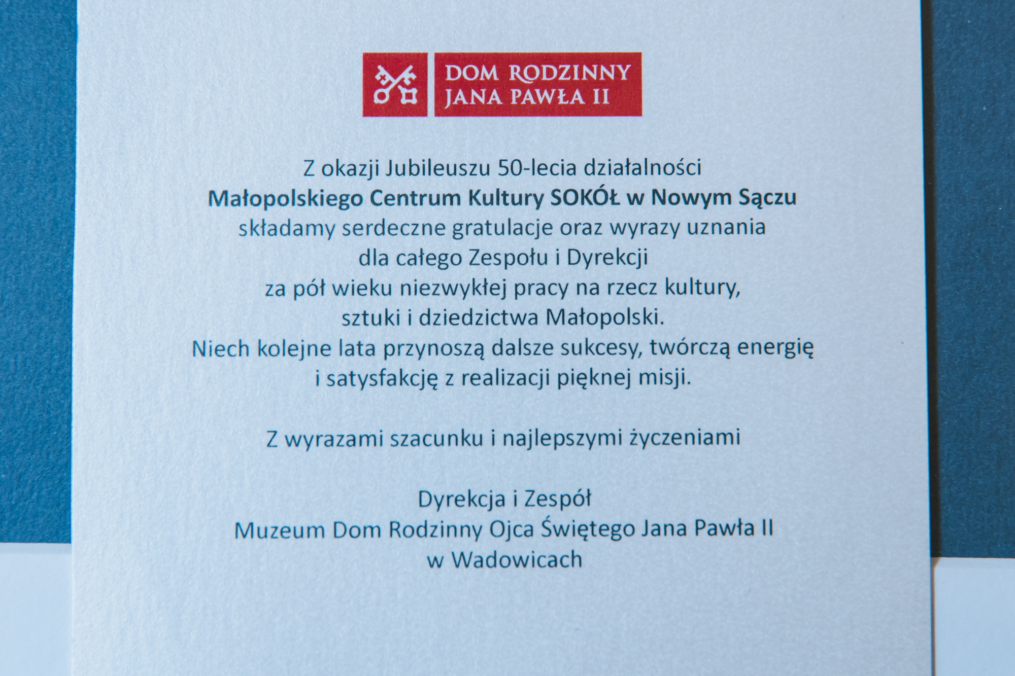 Dyrekcja i Pracownicy Małopolskiego Centrum Kultury SOKÓŁ z wielką wdzięcznością przyjęli przekazane słowa i podziękowania. Wszystkie nadesłane na Jubileusz życzenia, stanowią cenną pamiątkę tego wyjątkowego wydarzenia.