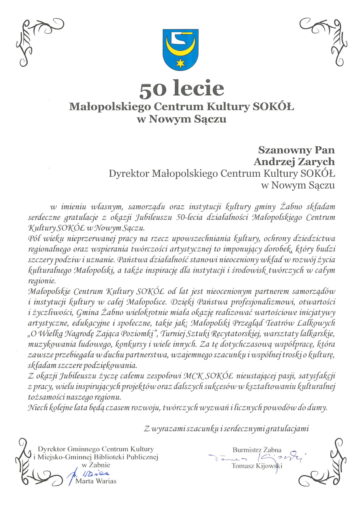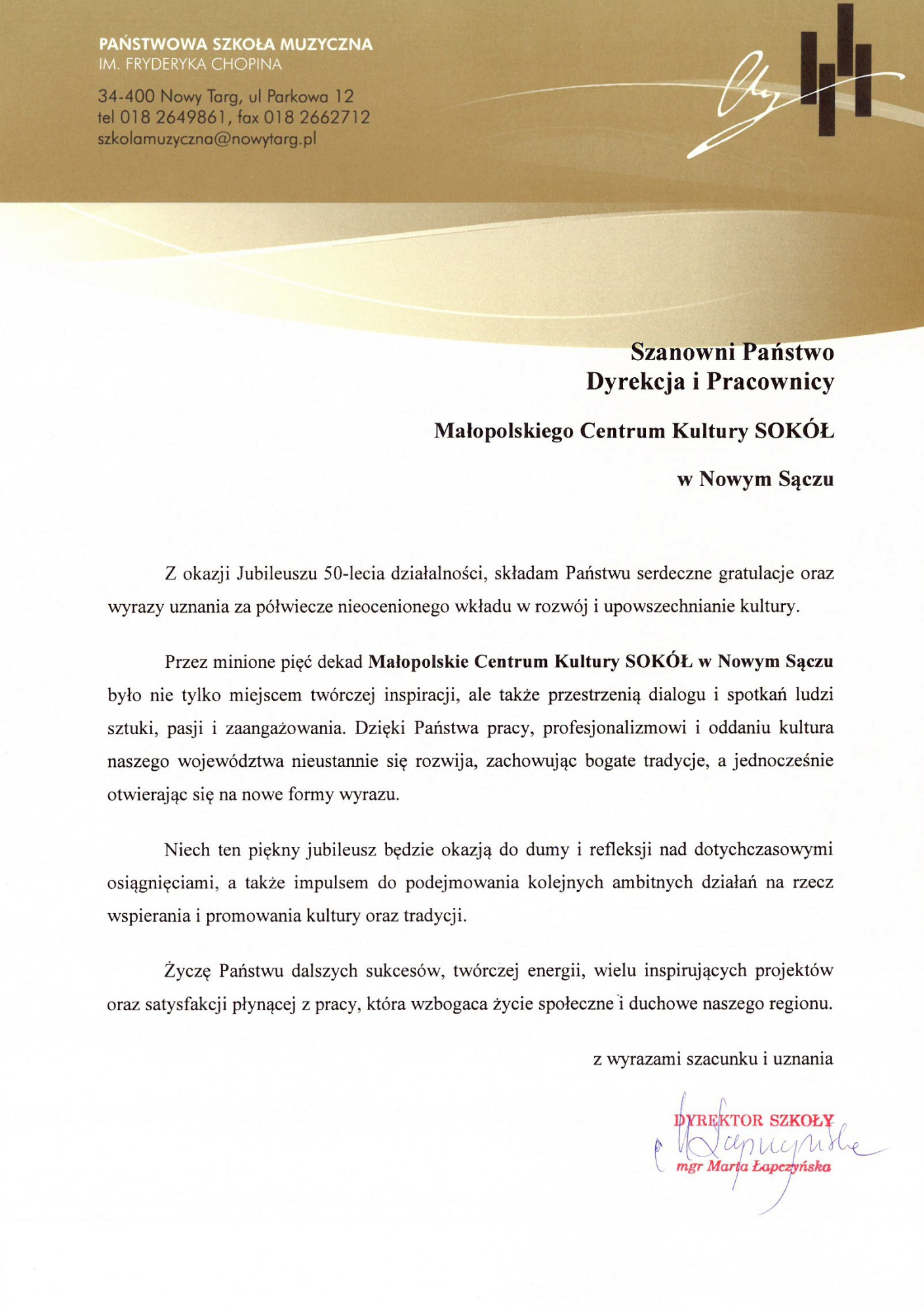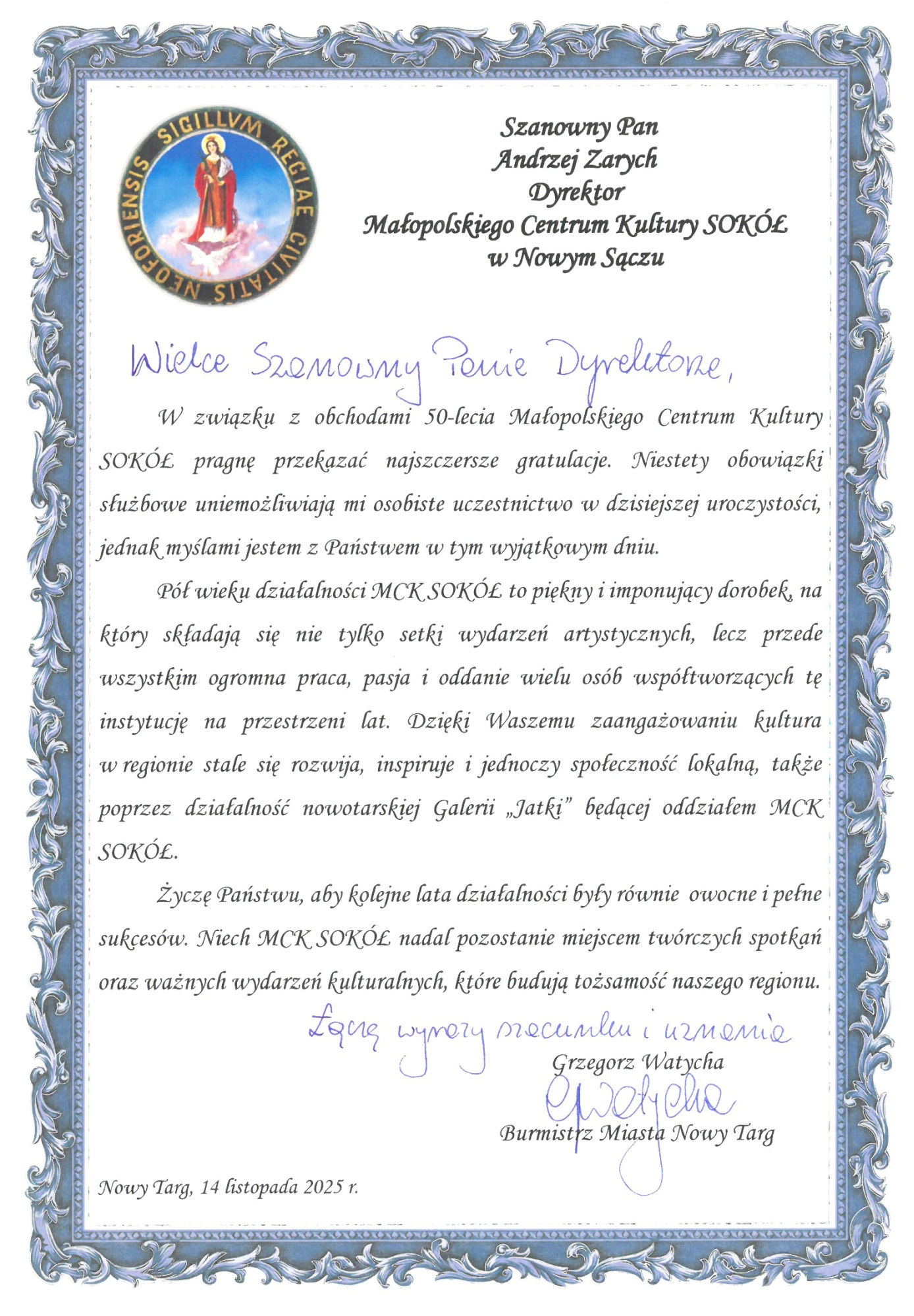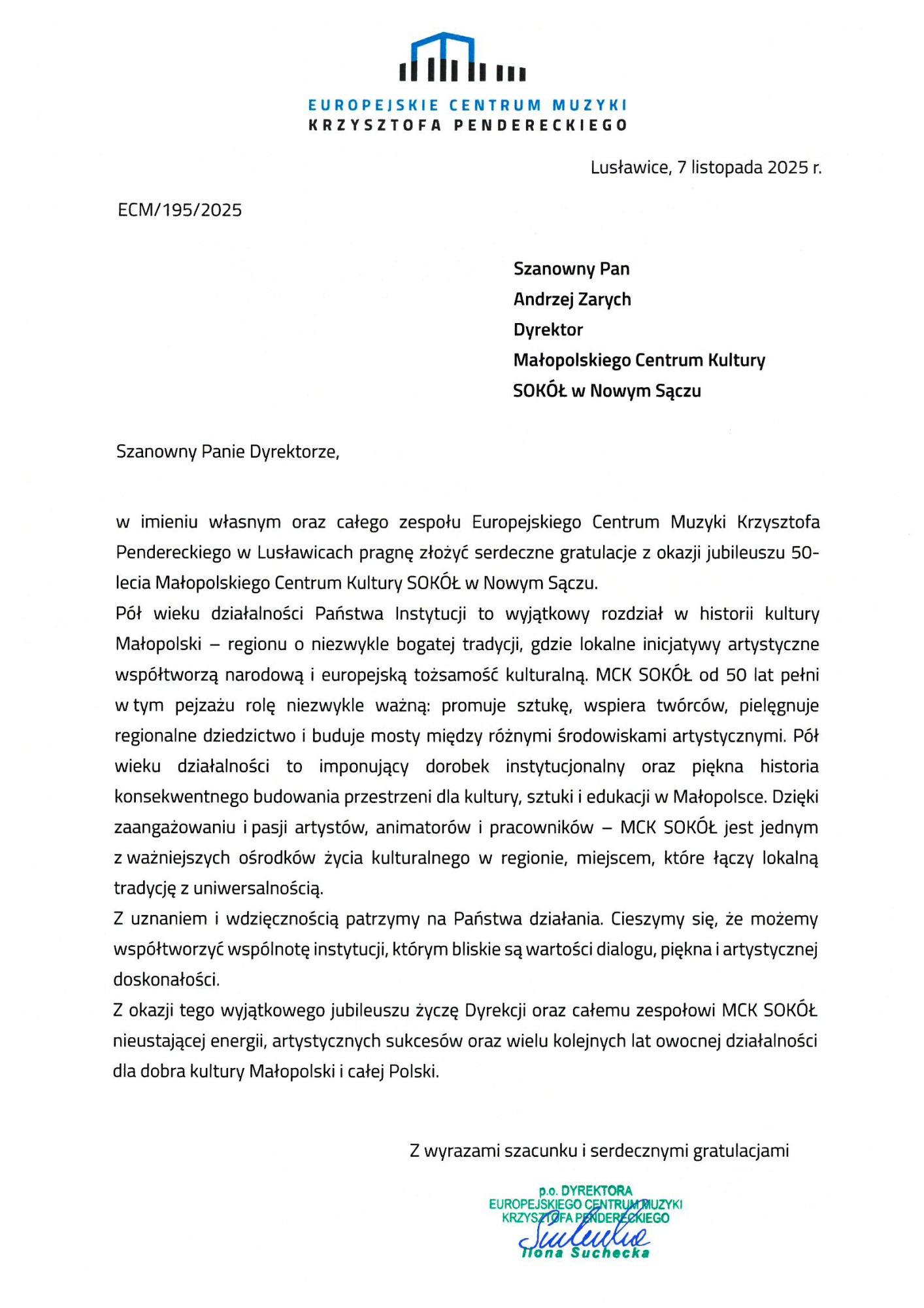 Dyrekcja i Pracownicy Małopolskiego Centrum Kultury SOKÓŁ z wielką wdzięcznością przyjęli przekazane słowa i podziękowania. Wszystkie nadesłane na Jubileusz życzenia, stanowią cenną pamiątkę tego wyjątkowego wydarzenia.