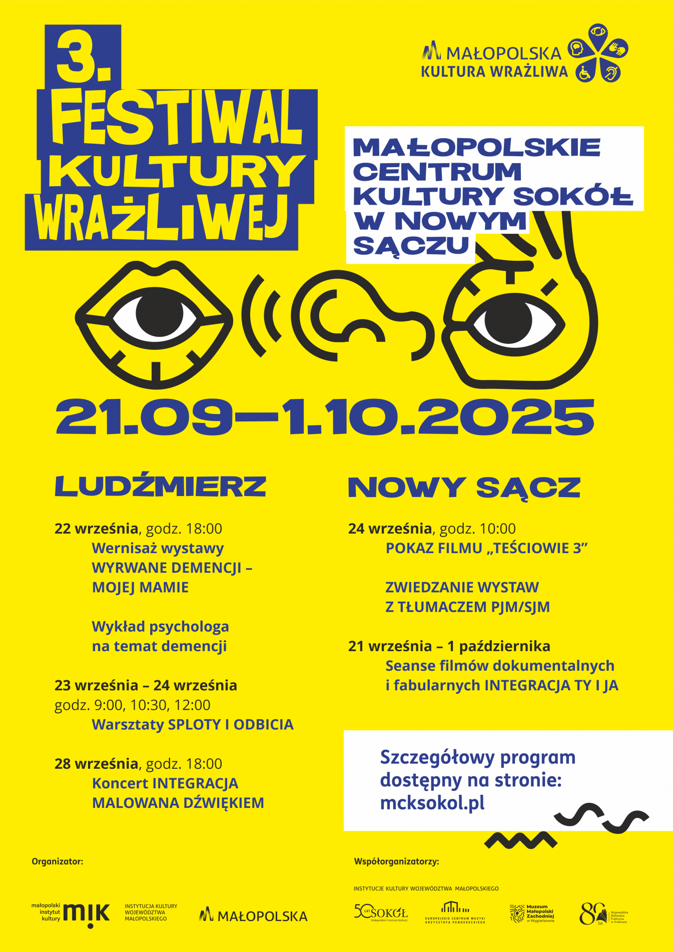 3. Festiwal Kultury Wrażliwej to wspólne przedsięwzięcie aż 28 instytucji kultury z całej Małopolski. Współorganizatorzy i partnerzy wydarzenia przygotowali około osiemdziesięciu różnorodnych wydarzeń, takich jak spektakle teatralne, koncerty, warsztaty artystyczne, pokazy filmowe oraz spacery i oprowadzania. Każde z nich zostało zaplanowane z myślą o pełnej dostępności dla osób z niepełnosprawnościami oraz tych, które mogą napotykać trudności w uczestnictwie w tradycyjnych formach kultury. Więcej o Festiwalu na stronie: kulturawrazliwa.pl