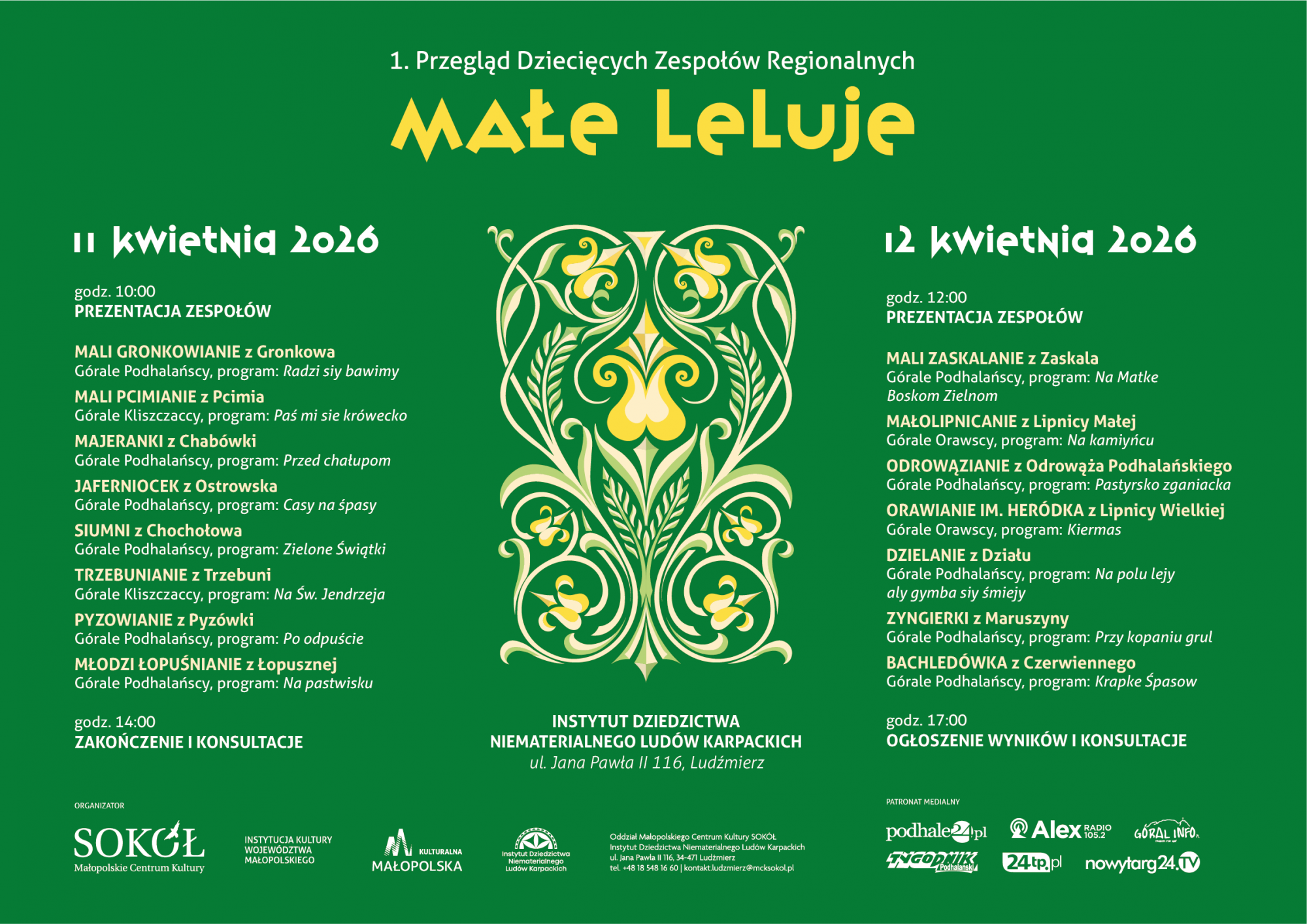 Małopolskie Centrum Kultury SOKÓŁ wraz z oddziałem – Instytutem Dziedzictwa Niematerialnego Ludów Karpackich w Ludźmierzu – zaprasza na 1. Przeglądzie Dziecięcych Zespołów Regionalnych MAŁE LELUJE, który odbędzie się w Ludźmierzu w dniach 11-12 kwietnia 2026 roku.
