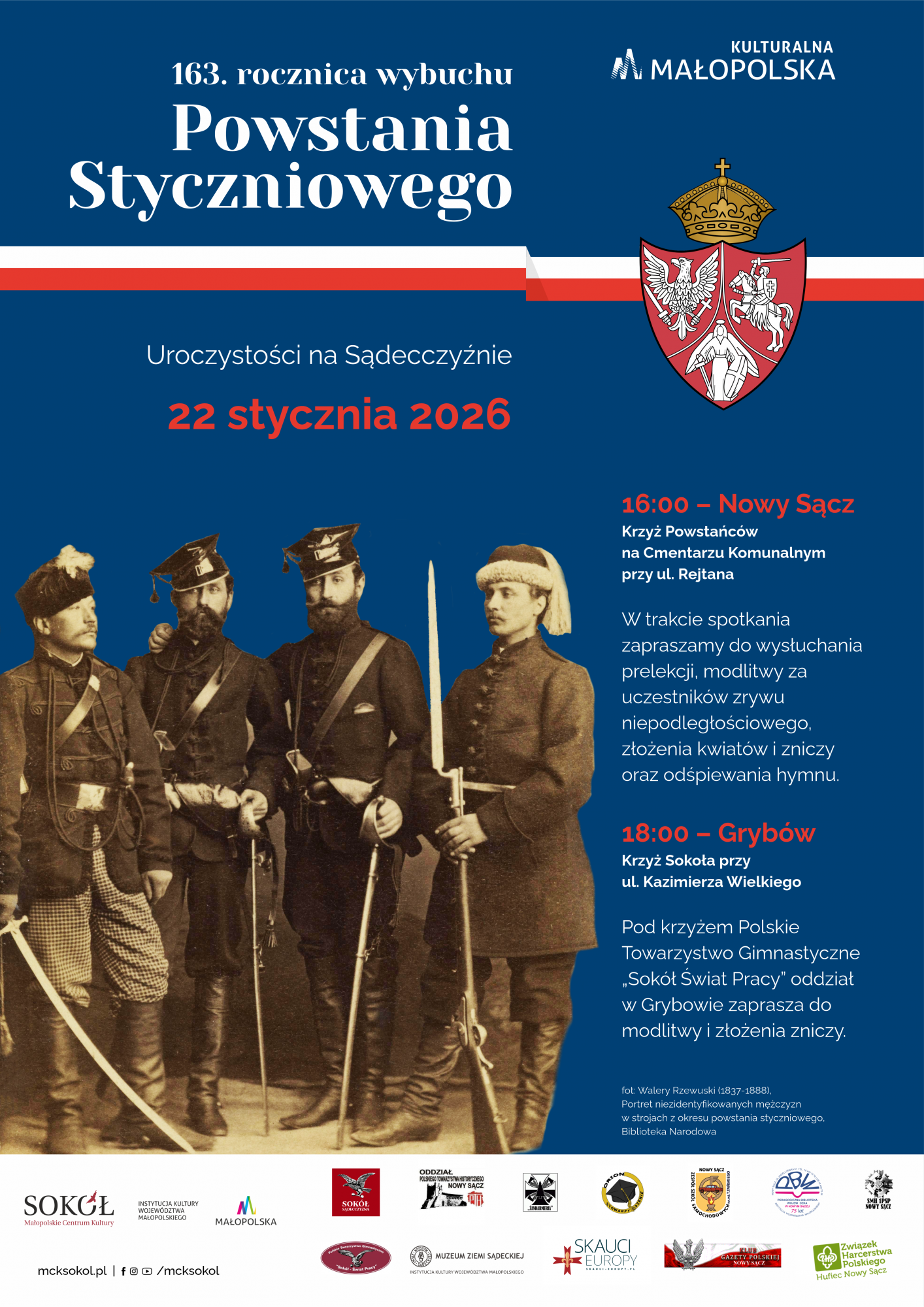 Zapraszamy mieszkańców Sądecczyzny na uroczystości upamiętniające 163. rocznicę wybuchu Powstania Styczniowego, które odbędą się w czwartek 22 stycznia 2026 roku. To wyjątkowa okazja do oddania hołdu bohaterom tego największego polskiego zrywu niepodległościowego, w którym liczny udział wzięli mieszkańcy ziemi sądeckiej.