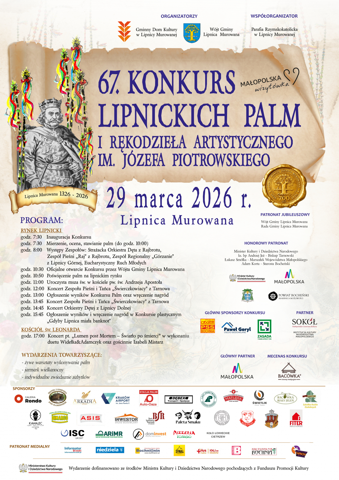 Gminny Dom Kultury w Lipnicy Murowanej oraz Wójt Gminy Lipnica Murowana zapraszają w Niedzielę Palmową, 29 marca, do Lipnicy Murowanej na najsłynniejszy w Polsce Konkurs Lipnickich Plam i Rękodzieła Artystycznego im. Józefa Piotrowskiego. To właśnie wtedy w szranki staną nieocenieni konstruktorzy palm, a ich wiklinowe dzieła dumnie wzniosą się nad lipnickim rynkiem.