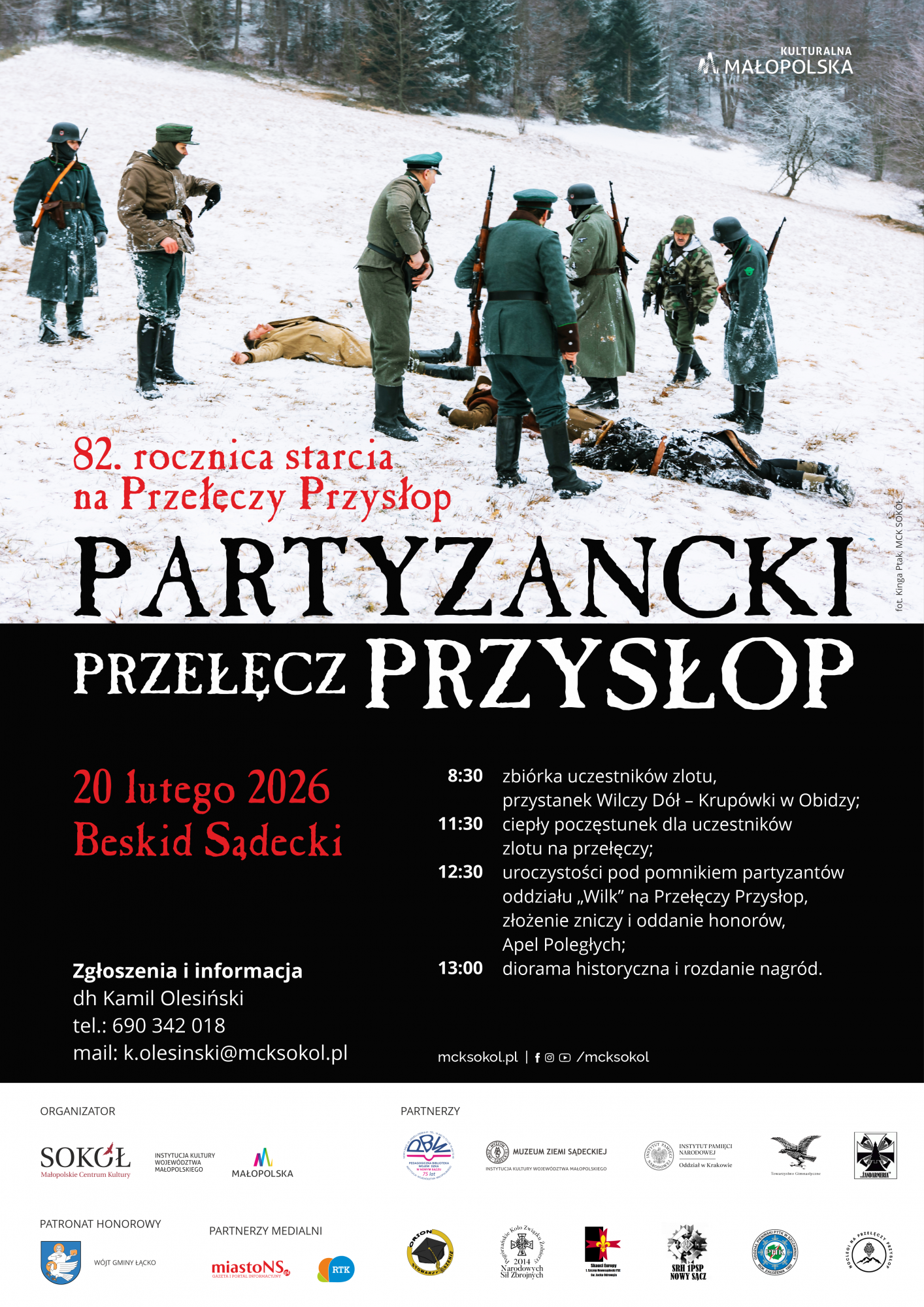 Małopolskie Centrum Kultury SOKÓŁ zaprasza na zlot upamiętniający poległych partyzantów Armii Krajowej z oddziału „Wilk”. Wydarzenie odbędzie się w czwartek, 20 lutego 2026, na Przełęczy Przysłop w Paśmie Radziejowej Beskidu Sądeckiego, w 82. rocznicę starcia na tym szlaku.