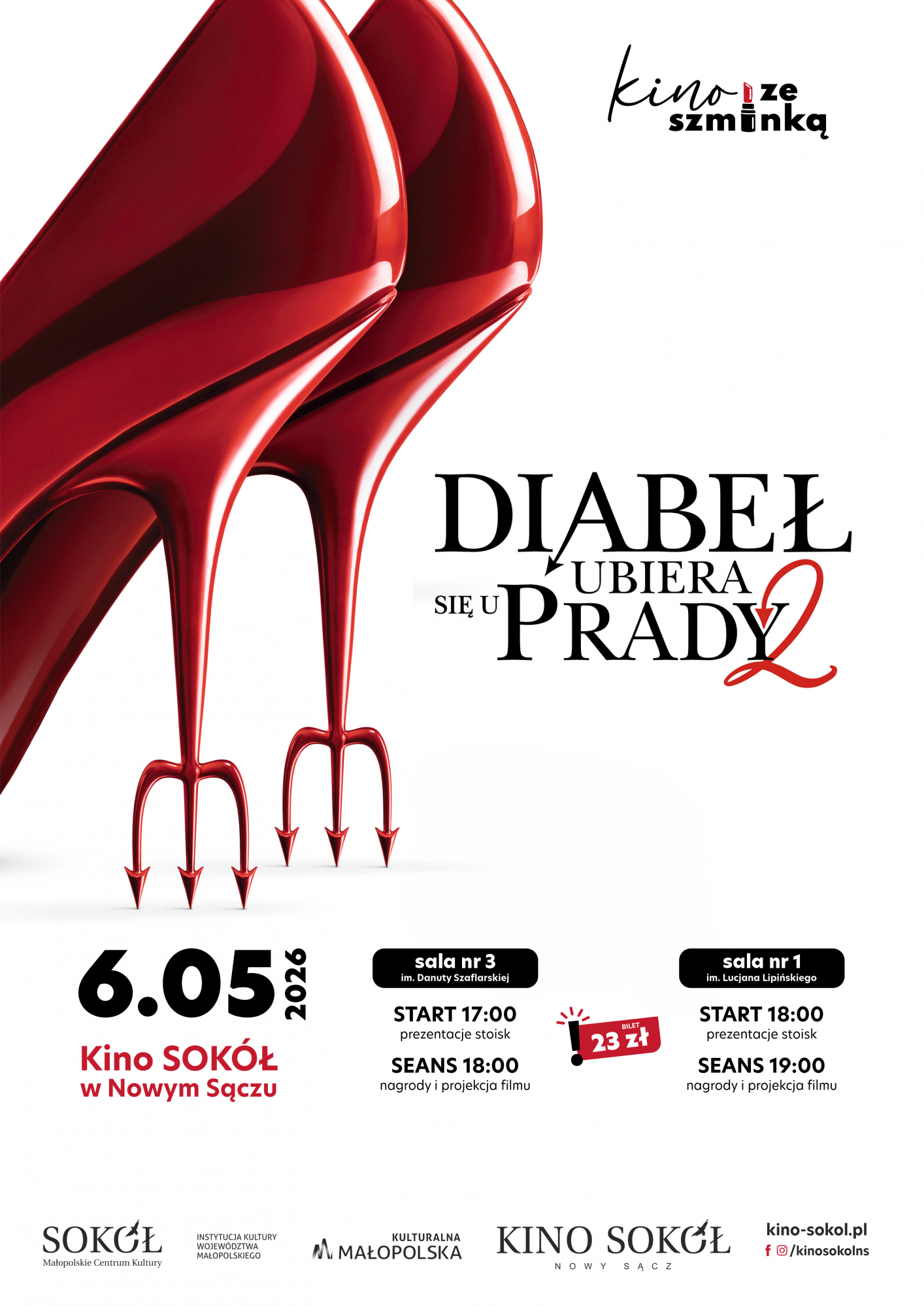 W środę, 6 maja 2026 roku, zapraszamy na kolejną odsłonę KINA ZE SZMINKĄ. Tym razem Kino SOKÓŁ przygotowało dwa pokazy filmu „Diabeł ubiera się u Prady 2”. Jak zawsze przed seansami na wszystkie Panie czeka losowanie atrakcyjnych nagród oraz możliwość skorzystania z porad i usług naszych Partnerów.