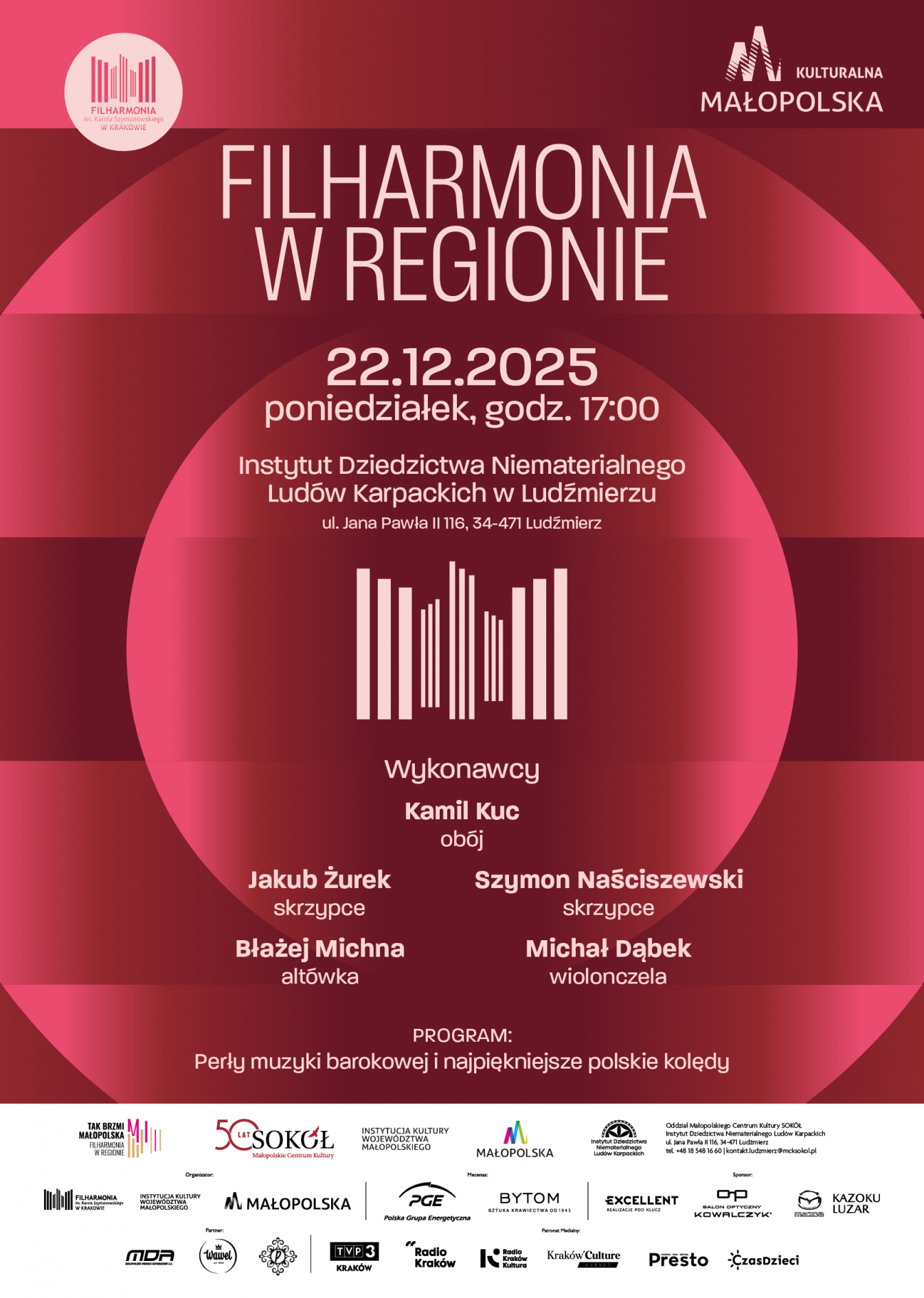Filharmonia im. Karola Szymanowskiego w Krakowie oraz Małopolskie Centrum Kultury SOKÓŁ w Nowym Sączu zapraszają w najbliższy poniedziałek, 22 grudnia na koncert z cyklu „Filharmonia w regionie”. Koncert odbędzie się w Instytucie Dziedzictwa Niematerialnego Ludów Karpackich w Ludźmierzu, o godzinie 17:00.
