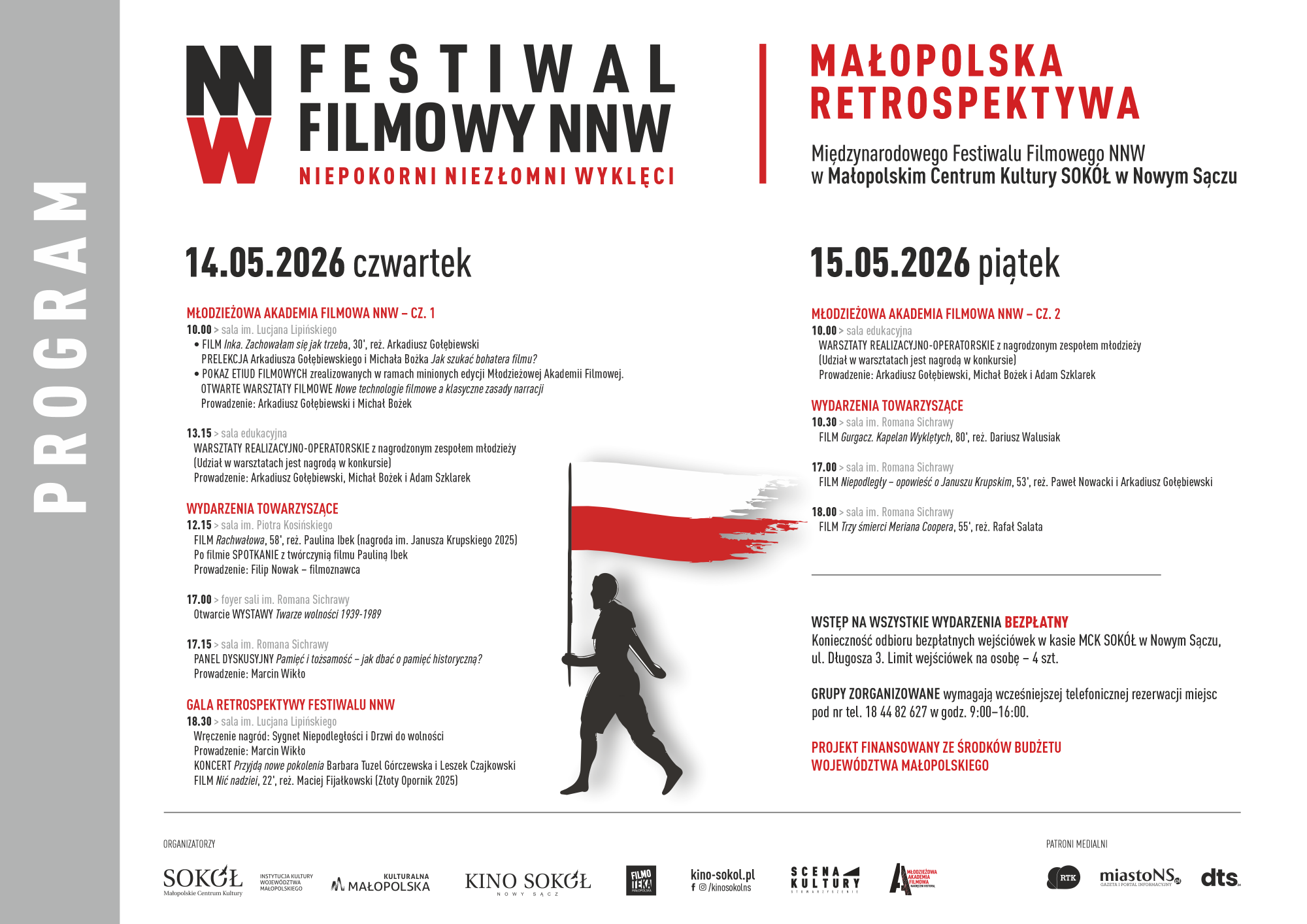 W dniach 14–15 maja zapraszamy do Małopolskiego Centrum Kultury SOKÓŁ w Nowym Sączu, gdzie w ramach Małopolskiej Retrospektywy Międzynarodowego Festiwalu Filmowego NNW zaprezentujemy nagradzane filmy dokumentalne i fabularne. W programie znajdą się kursy filmowe dla młodzieży, wystawa, panel dyskusyjny oraz koncert. Wydarzenie będzie doskonałą okazją do upamiętnienia lokalnych Świadków Historii, bohaterów walczących o niepodległość, a także osób działających w opozycji antykomunistycznej podczas uroczystej Gali Retrospektywy Festiwalu NNW.