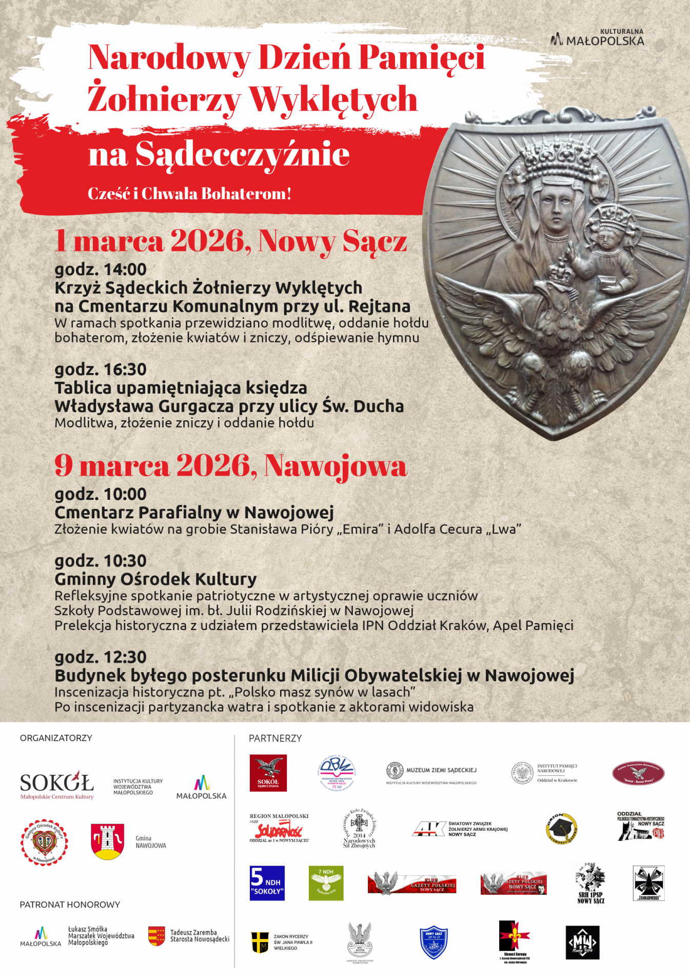Małopolskie Centrum Kultury SOKÓŁ zaprasza w niedzielę, 1 marca 2026 r., oraz w poniedziałek, 9 marca 2026 r., do udziału w obchodach Narodowego Dnia Pamięci Żołnierzy Wyklętych na Sądecczyźnie.