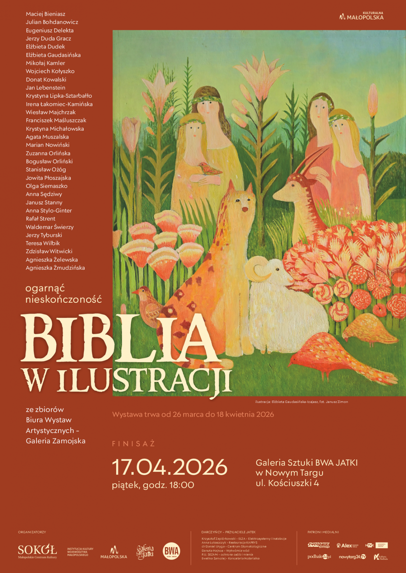 W piątek 17 kwietnia o godz. 18.00 w Galerii Sztuki BWA JATKI w Nowym Targu odbędzie się finisaż wystawy „Ogarnąć nieskończoność. Biblia w ilustracji” ze zbiorów Biura Wystaw Artystycznych – Galerii Zamojskiej. Ekspozycja prezentowana jest od 26 marca do 18 kwietnia 2026.