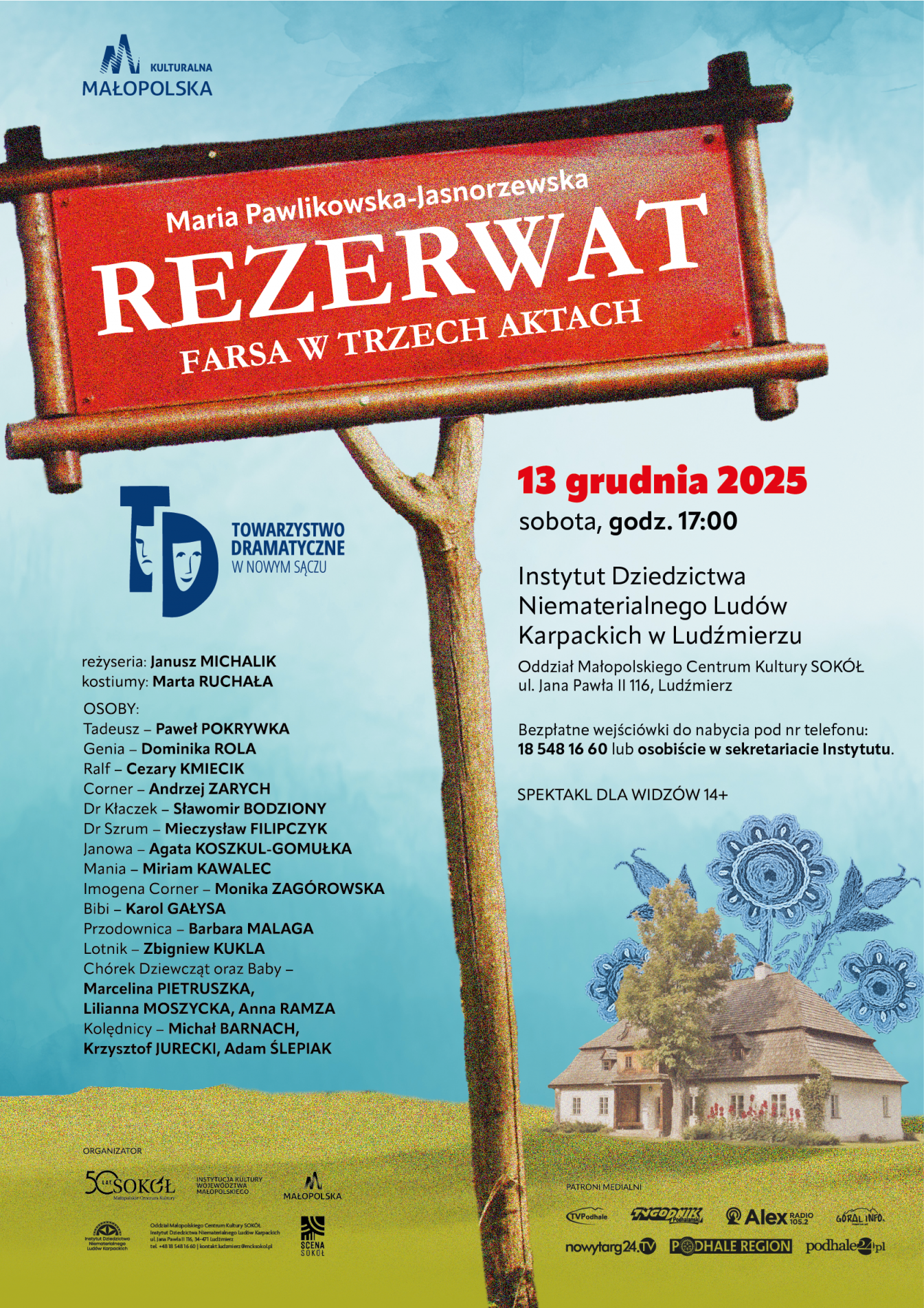 W roku ogłoszonym przez Senat RP Rokiem Marii Pawlikowskiej-Jasnorzewskiej Towarzystwo Dramatyczne przy Małopolskim Centrum Kultury SOKÓŁ w Nowym Sączu zaprasza na spektakl „Rezerwat” tej fascynującej artystki - poetki, dramatopisarki i malarki – pochodzącej ze słynnego rodu Kossaków. Wydarzenie odbędzie się 13 grudnia 2025 roku (sobota) o godz. 17:00 w Instytucie w Ludźmierzu.