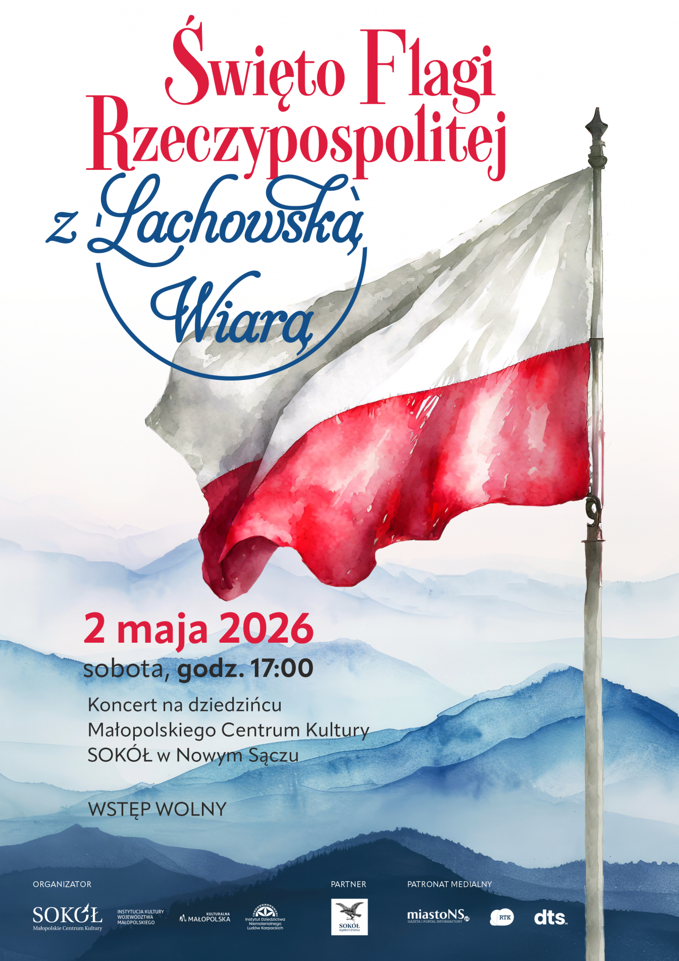 Od ponad dwudziestu lat w Polsce obchodzony jest Dzień Flagi Rzeczypospolitej Polskiej. Małopolskie Centrum Kultury SOKÓŁ zaprasza, w sobotę 2 maja 2026 roku o godzinie 17:00 na swój dziedziniec, do wspólnego, radosnego i zakorzenionego w tradycji świętowania tego dnia – po lachowsku.