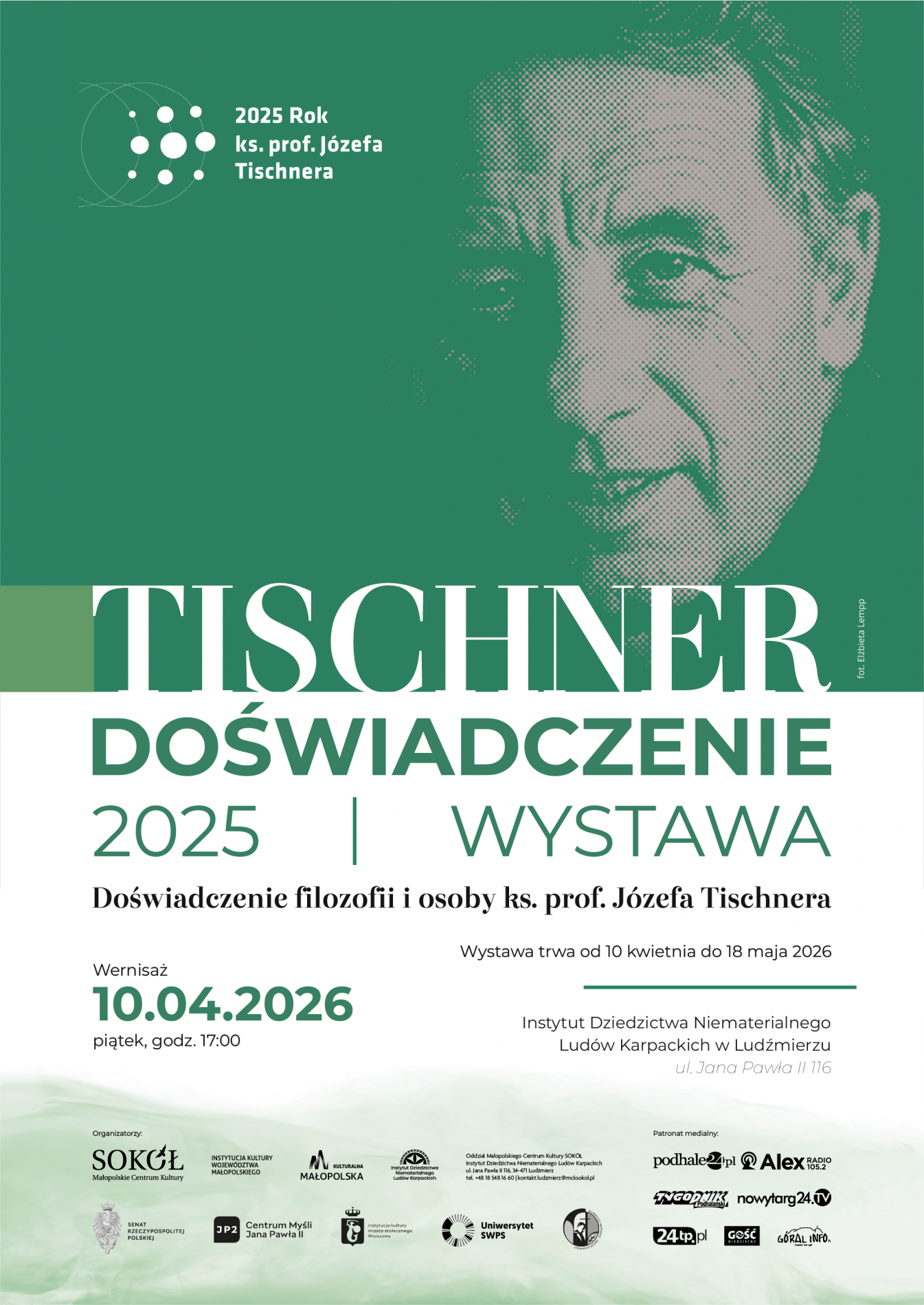 Małopolskie Centrum Kultury SOKÓŁ w Nowym Sączu oraz Stowarzyszenie Drogami Tischnera zapraszają na odwiedzenie wystawy „Tischner – doświadczenie 2025”, będącej wizytówką Roku Tischnerowskiego. Ekspozycja była prezentowana m.in. w Warszawie, Krakowie i Łodzi, a od 10 kwietnia 2026 roku będzie dostępna w Ludźmierzu. Wernisaż odbędzie się o godz. 17:00 w Instytucie Dziedzictwa Niematerialnego Ludów Karpackich w Ludźmierzu.
