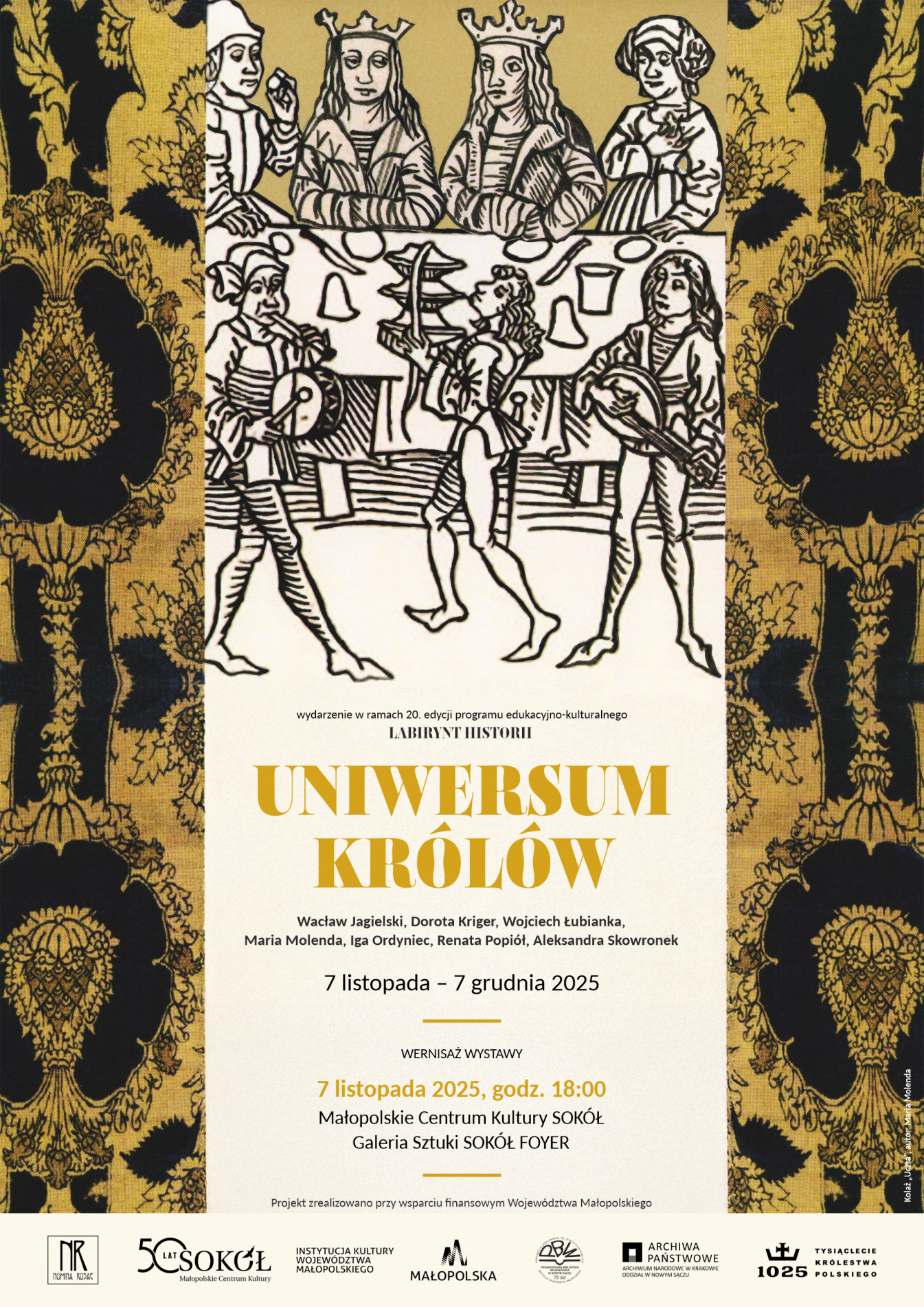 Serdecznie zapraszamy na wernisaż wystawy „Uniwersum Królów”, który odbędzie się 7 listopada 2025 roku (piątek) o godz. 18:00 w Galerii Sztuki SOKÓŁ FOYER Małopolskiego Centrum Kultury SOKÓŁ w Nowym Sączu. Wystawa otworzy jubileuszową, 20. edycję programu edukacyjno-kulturalnego LABIRYNT HISTORII, przebiegającą w tym roku pod hasłem „Misterium korony” – w nawiązaniu do 1000-lecia koronacji Bolesława Chrobrego i symbolicznego milenium Korony Polskiej.